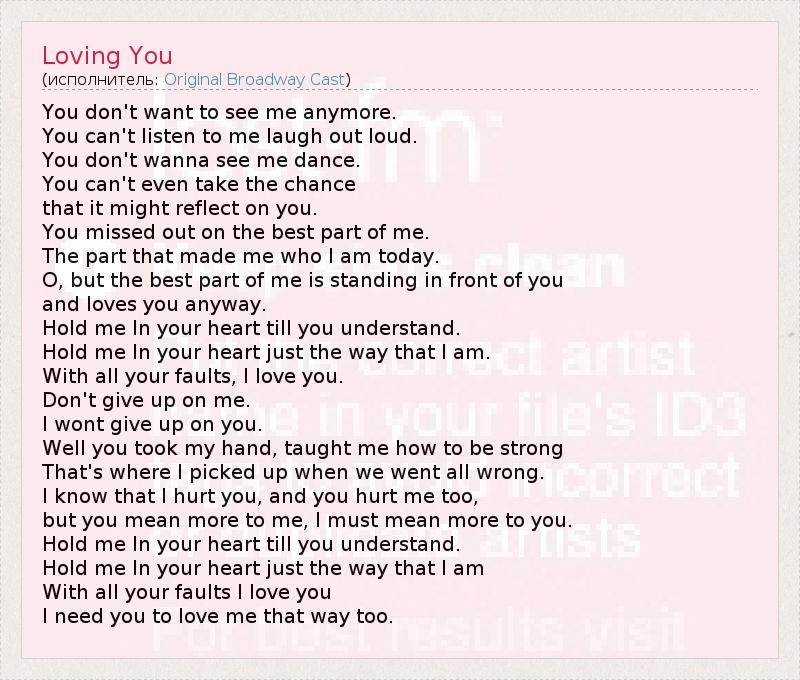 You don't want to see me anymore. You can't listen to me laugh out loud. You don't wanna see me dance. You can't even take the chance that it might reflect on you. You missed out on the best part of me. The part that made me who I am today. O, but the best part of me is standing in front of you and loves you anyway. Hold me In your heart till you understand. Hold me In your heart just the way that I am. With all your faults, I love you. Don't give up on me. I wont give up on you. Well you took my hand, taught me how to be strong That's where I picked up when we went all wrong. I know that I hurt you, and you hurt me too, but you mean more to me, I must mean more to you. Hold me In your heart till you understand. Hold me In your heart just the way that I am With all your faults I love you I need you to love me that way too.