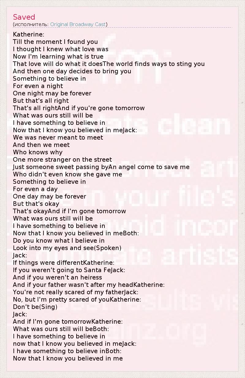 Katherine: Till the moment I found you I thought I knew what love was Now I'm learning what is true That love will do what it doesThe world finds ways to sting you And then one day decides to bring you Something to believe in For even a night One night may be forever But that's all right That's all rightAnd if you're gone tomorrow What was ours still will be I have something to believe in Now that I know you believed in meJack: We was never meant to meet And then we meet Who knows why One more stranger on the street Just someone sweet passing byAn angel come to save me Who didn't even know she gave me Something to believe in For even a day One day may be forever But that's okay That's okayAnd if I'm gone tomorrow What was ours still will be I have something to believe in Now that I know you believed in meBoth: Do you know what I believe in Look into my eyes and see(Spoken) Jack: If things were differentKatherine: If you weren't going to Santa FeJack: And if you weren't an heiress And if your father wasn't after my headKatherine: You're not really scared of my fatherJack: No, but I'm pretty scared of youKatherine: Don't be(Sing) Jack: And if I'm gone tomorrowKatherine: What was ours still will beBoth: I have something to believe in now that I know you believed in meJack: I have something to believe inBoth: Now that I know you believed in me