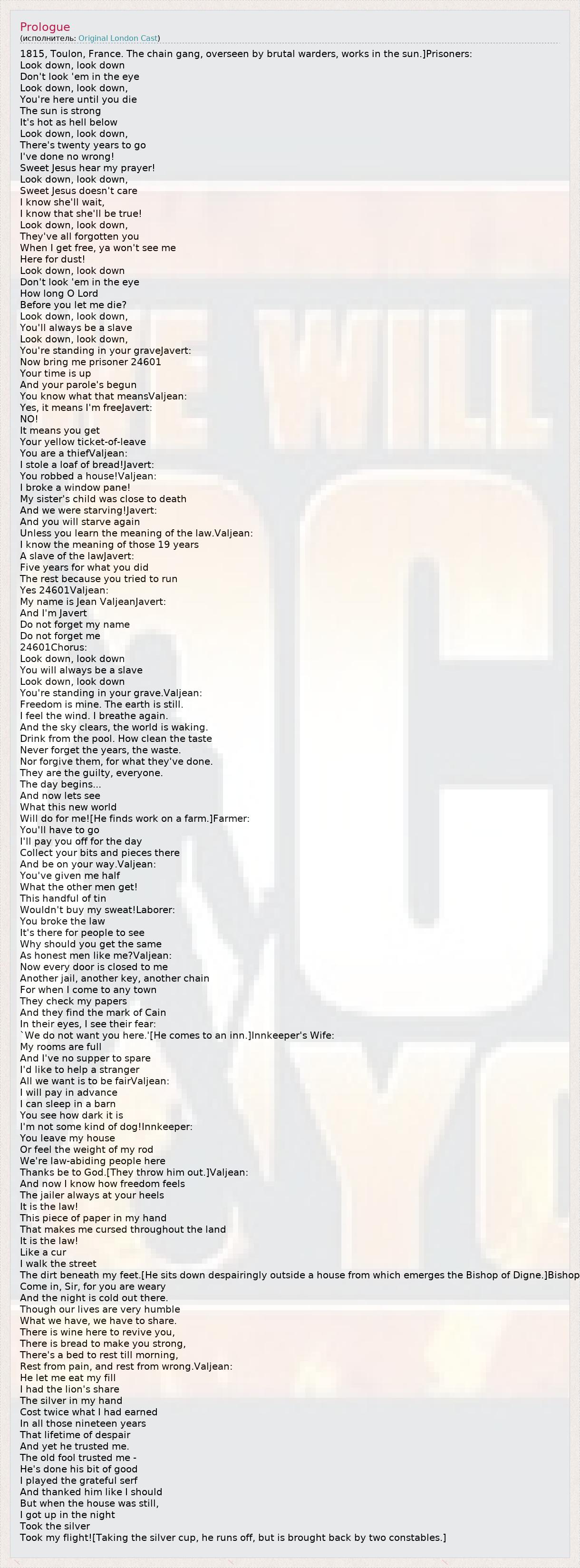 1815, Toulon, France. The chain gang, overseen by brutal warders, works in the sun.]Prisoners: Look down, look down Don't look 'em in the eye Look down, look down, You're here until you die The sun is strong It's hot as hell below Look down, look down, There's twenty years to go I've done no wrong! Sweet Jesus hear my prayer! Look down, look down, Sweet Jesus doesn't care I know she'll wait, I know that she'll be true! Look down, look down, They've all forgotten you When I get free, ya won't see me Here for dust! Look down, look down Don't look 'em in the eye How long O Lord Before you let me die? Look down, look down, You'll always be a slave Look down, look down, You're standing in your graveJavert: Now bring me prisoner 24601 Your time is up And your parole's begun You know what that meansValjean: Yes, it means I'm freeJavert: NO! It means you get Your yellow ticket-of-leave You are a thiefValjean: I stole a loaf of bread!Javert: You robbed a house!Valjean: I broke a window pane! My sister's child was close to death And we were starving!Javert: And you will starve again Unless you learn the meaning of the law.Valjean: I know the meaning of those 19 years A slave of the lawJavert: Five years for what you did The rest because you tried to run Yes 24601Valjean: My name is Jean ValjeanJavert: And I'm Javert Do not forget my name Do not forget me 24601Chorus: Look down, look down You will always be a slave Look down, look down You're standing in your grave.Valjean: Freedom is mine. The earth is still. I feel the wind. I breathe again. And the sky clears, the world is waking. Drink from the pool. How clean the taste Never forget the years, the waste. Nor forgive them, for what they've done. They are the guilty, everyone. The day begins... And now lets see What this new world Will do for me![He finds work on a farm.]Farmer: You'll have to go I'll pay you off for the day Collect your bits and pieces there And be on your way.Valjean: You've given me half What the other men get! This handful of tin Wouldn't buy my sweat!Laborer: You broke the law It's there for people to see Why should you get the same As honest men like me?Valjean: Now every door is closed to me Another jail, another key, another chain For when I come to any town They check my papers And they find the mark of Cain In their eyes, I see their fear: `We do not want you here.'[He comes to an inn.]Innkeeper's Wife: My rooms are full And I've no supper to spare I'd like to help a stranger All we want is to be fairValjean: I will pay in advance I can sleep in a barn You see how dark it is I'm not some kind of dog!Innkeeper: You leave my house Or feel the weight of my rod We're law-abiding people here Thanks be to God.[They throw him out.]Valjean: And now I know how freedom feels The jailer always at your heels It is the law! This piece of paper in my hand That makes me cursed throughout the land It is the law! Like a cur I walk the street The dirt beneath my feet.[He sits down despairingly outside a house from which emerges the Bishop of Digne.]Bishop Come in, Sir, for you are weary And the night is cold out there. Though our lives are very humble What we have, we have to share. There is wine here to revive you, There is bread to make you strong, There's a bed to rest till morning, Rest from pain, and rest from wrong.Valjean: He let me eat my fill I had the lion's share The silver in my hand Cost twice what I had earned In all those nineteen years That lifetime of despair And yet he trusted me. The old fool trusted me - He's done his bit of good I played the grateful serf And thanked him like I should But when the house was still, I got up in the night Took the silver Took my flight![Taking the silver cup, he runs off, but is brought back by two constables.]
