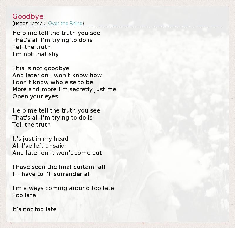 Help me tell the truth you see That's all I'm trying to do is Tell the truth I'm not that shy This is not goodbye And later on I won't know how I don't know who else to be More and more I'm secretly just me Open your eyes Help me tell the truth you see That's all I'm trying to do is Tell the truth It's just in my head All I've left unsaid And later on it won't come out I have seen the final curtain fall If I have to I'll surrender all I'm always coming around too late Too late It's not too late