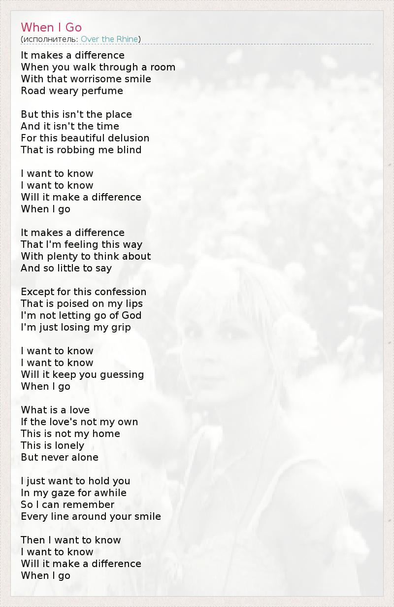 It makes a difference When you walk through a room With that worrisome smile Road weary perfume But this isn't the place And it isn't the time For this beautiful delusion That is robbing me blind I want to know I want to know Will it make a difference When I go It makes a difference That I'm feeling this way With plenty to think about And so little to say Except for this confession That is poised on my lips I'm not letting go of God I'm just losing my grip I want to know I want to know Will it keep you guessing When I go What is a love If the love's not my own This is not my home This is lonely But never alone I just want to hold you In my gaze for awhile So I can remember Every line around your smile Then I want to know I want to know Will it make a difference When I go