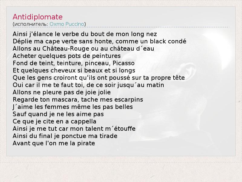 Ainsi j'élance le verbe du bout de mon long nez Déplie ma cape verte sans honte, comme un black condé Allons au Château-Rouge ou au château d´eau Acheter quelques pots de peintures Fond de teint, teinture, pinceau, Picasso Et quelques cheveux si beaux et si longs Que les gens croiront qu'ils ont poussé sur ta propre tête Oui car il me te faut toi, de ce soir jusqu´au matin Allons ne pleure pas de joie jolie Regarde ton mascara, tache mes escarpins J´aime les femmes même les pas belles Sauf quand je ne les aime pas Ce que je cite en a cappella Ainsi je me tut car mon talent m´étouffe Ainsi du final je ponctue ma tirade Avant que l'on me la pirate