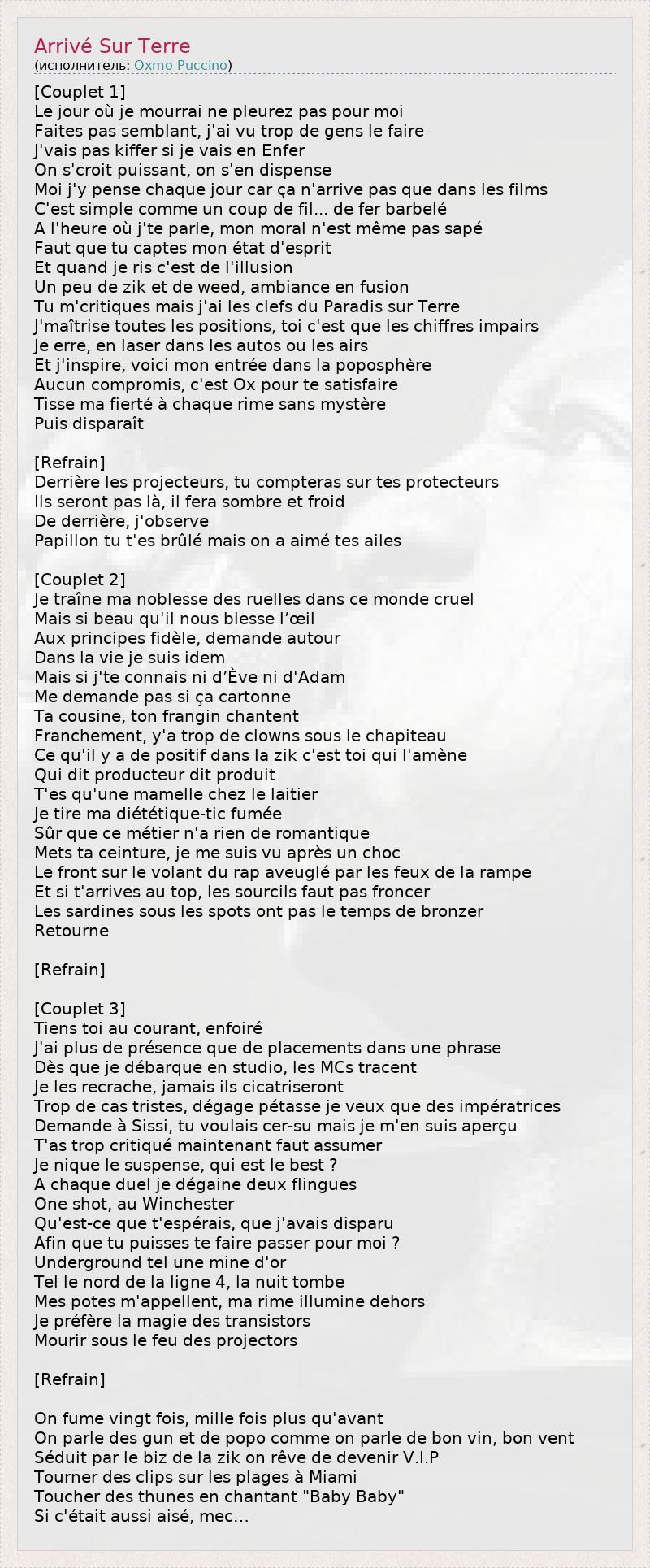 [Couplet 1] Le jour où je mourrai ne pleurez pas pour moi Faites pas semblant, j'ai vu trop de gens le faire J'vais pas kiffer si je vais en Enfer On s'croit puissant, on s'en dispense Moi j'y pense chaque jour car ça n'arrive pas que dans les films C'est simple comme un coup de fil... de fer barbelé A l'heure où j'te parle, mon moral n'est même pas sapé Faut que tu captes mon état d'esprit Et quand je ris c'est de l'illusion Un peu de zik et de weed, ambiance en fusion Tu m'critiques mais j'ai les clefs du Paradis sur Terre J'maîtrise toutes les positions, toi c'est que les chiffres impairs Je erre, en laser dans les autos ou les airs Et j'inspire, voici mon entrée dans la poposphère Aucun compromis, c'est Ox pour te satisfaire Tisse ma fierté à chaque rime sans mystère Puis disparaît [Refrain] Derrière les projecteurs, tu compteras sur tes protecteurs Ils seront pas là, il fera sombre et froid De derrière, j'observe Papillon tu t'es brûlé mais on a aimé tes ailes [Couplet 2] Je traîne ma noblesse des ruelles dans ce monde cruel Mais si beau qu'il nous blesse l’œil Aux principes fidèle, demande autour Dans la vie je suis idem Mais si j'te connais ni d’Ève ni d'Adam Me demande pas si ça cartonne Ta cousine, ton frangin chantent Franchement, y'a trop de clowns sous le chapiteau Ce qu'il y a de positif dans la zik c'est toi qui l'amène Qui dit producteur dit produit T'es qu'une mamelle chez le laitier Je tire ma diététique-tic fumée Sûr que ce métier n'a rien de romantique Mets ta ceinture, je me suis vu après un choc Le front sur le volant du rap aveuglé par les feux de la rampe Et si t'arrives au top, les sourcils faut pas froncer Les sardines sous les spots ont pas le temps de bronzer Retourne [Refrain] [Couplet 3] Tiens toi au courant, enfoiré J'ai plus de présence que de placements dans une phrase Dès que je débarque en studio, les MCs tracent Je les recrache, jamais ils cicatriseront Trop de cas tristes, dégage pétasse je veux que des impératrices Demande à Sissi, tu voulais cer-su mais je m'en suis aperçu T'as trop critiqué maintenant faut assumer Je nique le suspense, qui est le best ? A chaque duel je dégaine deux flingues One shot, au Winchester Qu'est-ce que t'espérais, que j'avais disparu Afin que tu puisses te faire passer pour moi ? Underground tel une mine d'or Tel le nord de la ligne 4, la nuit tombe Mes potes m'appellent, ma rime illumine dehors Je préfère la magie des transistors Mourir sous le feu des projectors [Refrain] On fume vingt fois, mille fois plus qu'avant On parle des gun et de popo comme on parle de bon vin, bon vent Séduit par le biz de la zik on rêve de devenir V.I.P Tourner des clips sur les plages à Miami Toucher des thunes en chantant "Baby Baby" Si c'était aussi aisé, mec…