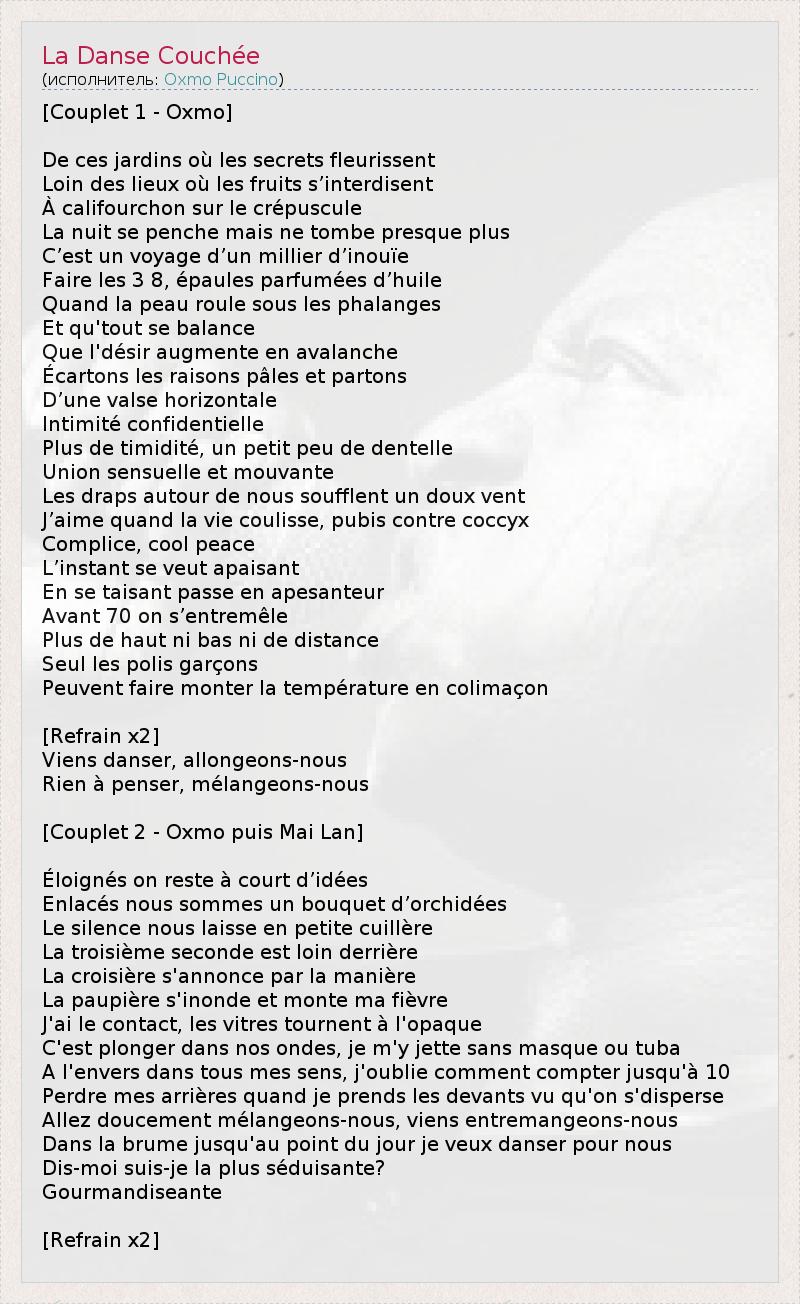 [Couplet 1 - Oxmo] De ces jardins où les secrets fleurissent Loin des lieux où les fruits s’interdisent À califourchon sur le crépuscule La nuit se penche mais ne tombe presque plus C’est un voyage d’un millier d’inouïe Faire les 3 8, épaules parfumées d’huile Quand la peau roule sous les phalanges Et qu'tout se balance Que l'désir augmente en avalanche Écartons les raisons pâles et partons D’une valse horizontale Intimité confidentielle Plus de timidité, un petit peu de dentelle Union sensuelle et mouvante Les draps autour de nous soufflent un doux vent J’aime quand la vie coulisse, pubis contre coccyx Complice, cool peace L’instant se veut apaisant En se taisant passe en apesanteur Avant 70 on s’entremêle Plus de haut ni bas ni de distance Seul les polis garçons Peuvent faire monter la température en colimaçon [Refrain x2] Viens danser, allongeons-nous Rien à penser, mélangeons-nous [Couplet 2 - Oxmo puis Mai Lan] Éloignés on reste à court d’idées Enlacés nous sommes un bouquet d’orchidées Le silence nous laisse en petite cuillère La troisième seconde est loin derrière La croisière s'annonce par la manière La paupière s'inonde et monte ma fièvre J'ai le contact, les vitres tournent à l'opaque C'est plonger dans nos ondes, je m'y jette sans masque ou tuba A l'envers dans tous mes sens, j'oublie comment compter jusqu'à 10 Perdre mes arrières quand je prends les devants vu qu'on s'disperse Allez doucement mélangeons-nous, viens entremangeons-nous Dans la brume jusqu'au point du jour je veux danser pour nous Dis-moi suis-je la plus séduisante? Gourmandiseante [Refrain x2]