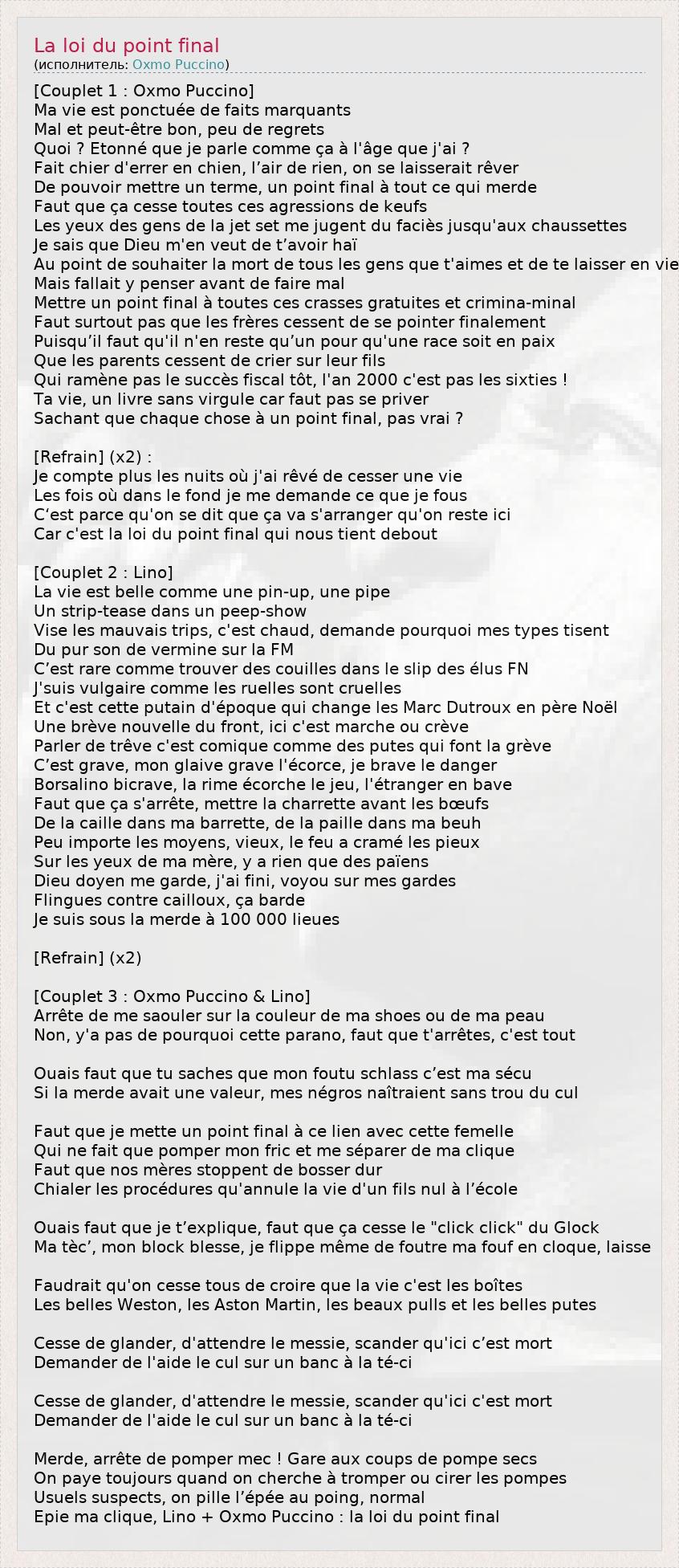[Couplet 1 : Oxmo Puccino] Ma vie est ponctuée de faits marquants Mal et peut-être bon, peu de regrets Quoi ? Etonné que je parle comme ça à l'âge que j'ai ? Fait chier d'errer en chien, l’air de rien, on se laisserait rêver De pouvoir mettre un terme, un point final à tout ce qui merde Faut que ça cesse toutes ces agressions de keufs Les yeux des gens de la jet set me jugent du faciès jusqu'aux chaussettes Je sais que Dieu m'en veut de t’avoir haï Au point de souhaiter la mort de tous les gens que t'aimes et de te laisser en vie Mais fallait y penser avant de faire mal Mettre un point final à toutes ces crasses gratuites et crimina-minal Faut surtout pas que les frères cessent de se pointer finalement Puisqu’il faut qu'il n'en reste qu’un pour qu'une race soit en paix Que les parents cessent de crier sur leur fils Qui ramène pas le succès fiscal tôt, l'an 2000 c'est pas les sixties ! Ta vie, un livre sans virgule car faut pas se priver Sachant que chaque chose à un point final, pas vrai ? [Refrain] (x2) : Je compte plus les nuits où j'ai rêvé de cesser une vie Les fois où dans le fond je me demande ce que je fous C‘est parce qu'on se dit que ça va s'arranger qu'on reste ici Car c'est la loi du point final qui nous tient debout [Couplet 2 : Lino] La vie est belle comme une pin-up, une pipe Un strip-tease dans un peep-show Vise les mauvais trips, c'est chaud, demande pourquoi mes types tisent Du pur son de vermine sur la FM C’est rare comme trouver des couilles dans le slip des élus FN J'suis vulgaire comme les ruelles sont cruelles Et c'est cette putain d'époque qui change les Marc Dutroux en père Noël Une brève nouvelle du front, ici c'est marche ou crève Parler de trêve c'est comique comme des putes qui font la grève C’est grave, mon glaive grave l'écorce, je brave le danger Borsalino bicrave, la rime écorche le jeu, l'étranger en bave Faut que ça s'arrête, mettre la charrette avant les bœufs De la caille dans ma barrette, de la paille dans ma beuh Peu importe les moyens, vieux, le feu a cramé les pieux Sur les yeux de ma mère, y a rien que des païens Dieu doyen me garde, j'ai fini, voyou sur mes gardes Flingues contre cailloux, ça barde Je suis sous la merde à 100 000 lieues [Refrain] (x2) [Couplet 3 : Oxmo Puccino & Lino] Arrête de me saouler sur la couleur de ma shoes ou de ma peau Non, y'a pas de pourquoi cette parano, faut que t'arrêtes, c'est tout Ouais faut que tu saches que mon foutu schlass c’est ma sécu Si la merde avait une valeur, mes négros naîtraient sans trou du cul Faut que je mette un point final à ce lien avec cette femelle Qui ne fait que pomper mon fric et me séparer de ma clique Faut que nos mères stoppent de bosser dur Chialer les procédures qu'annule la vie d'un fils nul à l’école Ouais faut que je t’explique, faut que ça cesse le "click click" du Glock Ma tèc’, mon block blesse, je flippe même de foutre ma fouf en cloque, laisse Faudrait qu'on cesse tous de croire que la vie c'est les boîtes Les belles Weston, les Aston Martin, les beaux pulls et les belles putes Cesse de glander, d'attendre le messie, scander qu'ici c’est mort Demander de l'aide le cul sur un banc à la té-ci Cesse de glander, d'attendre le messie, scander qu'ici c'est mort Demander de l'aide le cul sur un banc à la té-ci Merde, arrête de pomper mec ! Gare aux coups de pompe secs On paye toujours quand on cherche à tromper ou cirer les pompes Usuels suspects, on pille l’épée au poing, normal Epie ma clique, Lino + Oxmo Puccino : la loi du point final