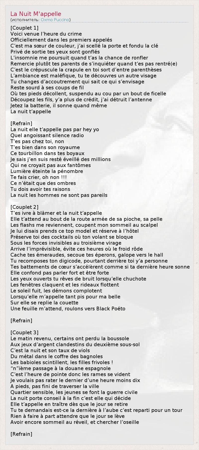 [Couplet 1] Voici venue l’heure du crime Officiellement dans les premiers appelés C’est ma sœur de couleur, j’ai scellé la porte et fondu la clé Privé de sortie tes yeux sont gonflés L’insomnie me poursuit quand t’as la chance de ronfler Remercie plutôt tes parents de s’inquiéter quand t’es pas rentré(e) C’est le crépuscule la crapule en toi sort d’entre parenthèses L’ambiance est maléfique, tu te découvres un autre visage Tu changes d’accoutrement qui sait ce qui s’envisage Reste sourd à ses coups de fil Où tes pieds décollent, suspendu au cou par un bout de ficelle Découpez les fils, y’a plus de crédit, j’ai détruit l’antenne Jetez la batterie, il sonne quand même La nuit t’appelle [Refrain] La nuit elle t’appelle pas par hey yo Quel angoissant silence radio T’es pas chez toi, non T’es bien dans son royaume Ce tourbillon dans tes boyaux Je sais j’en suis resté éveillé des millions Qui ne croyait pas aux fantômes Lumière éteinte la pénombre Te fais crier, oh non !!! Ce n’était que des ombres Tu dois avoir tes raisons La nuit les hommes ne sont pas pareils [Couplet 2] T’es ivre à blâmer et la nuit t’appelle Elle t’attend au bout de la route armée de sa pioche, sa pelle Les flashs me reviennent, coupent mon sommeil au scalpel Je lui disais prends ce top model et réserve à l’hôtel Préserve toi des cocktails où ton volant se bloque Sous les forces invisibles au troisième virage Arrive l’imprévisible, évite ces heures où le froid rôde Cache tes émeraudes, secoue tes éperons, galope vers le hall Tu recomposes ton digicode, pourtant derrière toi y’a personne Tes battements de cœur s’accélèrent comme si ta dernière heure sonne Elle confond pas parler fort et être forte Les yeux ouverts tu rêves de bruit lorsqu’elle chuchote Les fenêtres claquent et les rideaux flottent Le soleil fuit, les démons complotent Lorsqu’elle m’appelle tant pis pour ma belle Sur elle se replie la couette Une feuille m’attend, roulons vers Black Poéto [Refrain] [Couplet 3] Le matin revenu, certains ont perdu la boussole Aux jeux d’argent clandestins du deuxième sous-sol C’est la nuit et son taux de viols Du métal dans le coffre des bagnoles Les babioles scintillent, les filles frivoles ! “n”ième passage à la douane espagnole C’est l’heure de pointe donc les rames se vident Je voulais pas rater le dernier d’une heure moins dix A pieds, pas fini de traverser la ville Quartier sensible, les jeunes se font la guerre civile La nuit porte conseil à la fin c’est elle qui décide Elle t’appelle en traître dès que le jour se retire Tu te demandais est-ce la dernière à l’aube c’est reparti pour un tour Rien à faire à part attendre que le jour se lève Avoir encore sommeil au réveil, et chercher l’oseille [Refrain]