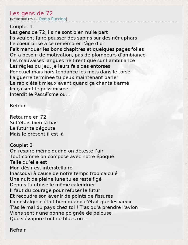 Couplet 1 Les gens de 72, ils ne sont bien nulle part Ils veulent faire pousser des sapins sur des nénuphars Le coeur brisé à se remémorer l'âge d'or Fait manquer les bons chapitres et quelques pages folles On a besoin de motivation, pas de plombeurs d'ambiance Les mauvaises langues ne tirent que sur l'ambulance Les règles du jeu, je leurs fais des entorses Ponctuel mais hors tendance les mots dans le torse La guerre terminée tu peux maintenant parler Le rap c'était mieux avant quand ça chantait armé Ici ça sent le pessimisme Interdit le Passéïsme ou... Refrain Retourne en 72 Si t'étais bien là bas Le futur te dégoute Mais le présent il est là Couplet 2 On respire même quand on déteste l'air Tout comme on compose avec notre époque Telle qu'elle est Mon désir est interstellaire Inassouvi à cause de notre temps trop calculé Une nuit de pleine lune tu es resté figé Depuis tu utilise le même calendrier Il faut du courage pour refuser le futur Et recoudre son avenir de points de fissures La nostalgie c'était bien quand c'était que les vieux T'as le mal du pays chez toi ! T'as qu'à prendre l'avion Viens sentir une bonne poignée de pelouse Que s'évapore tout ce blues ou... Refrain