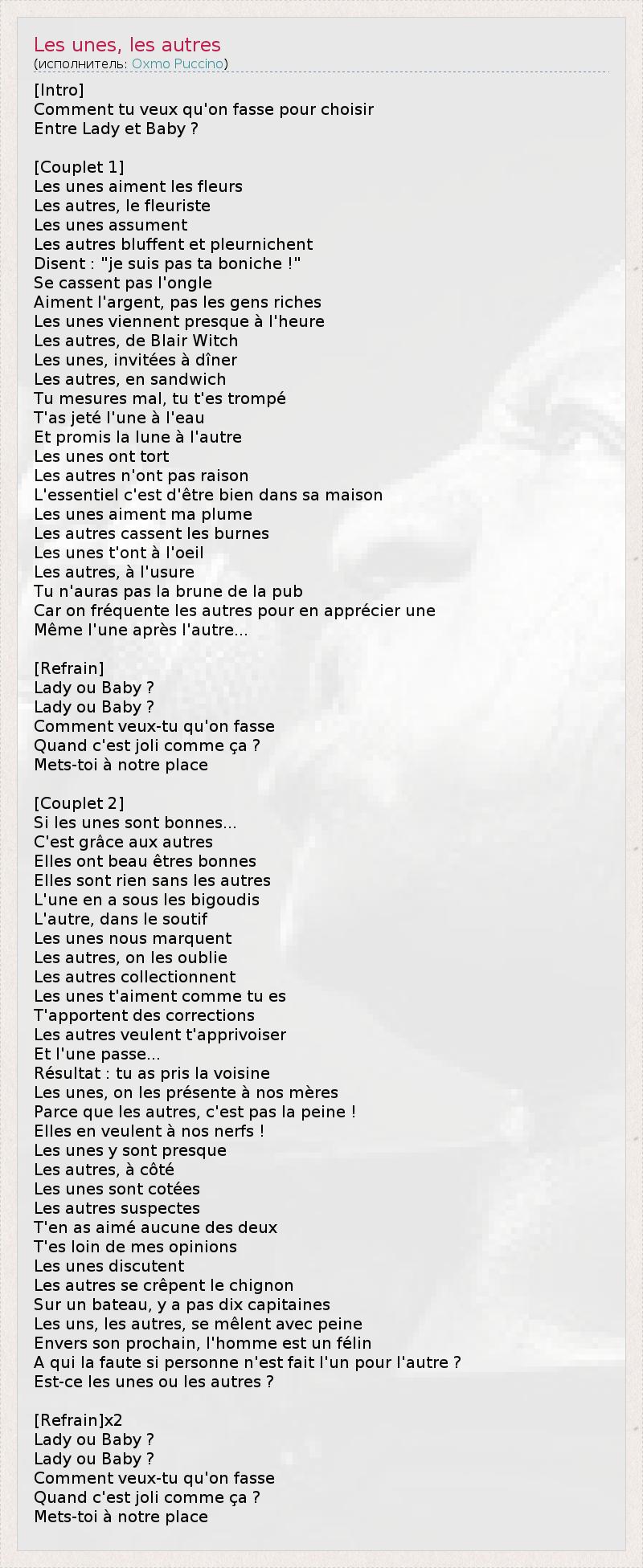 [Intro] Comment tu veux qu'on fasse pour choisir Entre Lady et Baby ? [Couplet 1] Les unes aiment les fleurs Les autres, le fleuriste Les unes assument Les autres bluffent et pleurnichent Disent : "je suis pas ta boniche !" Se cassent pas l'ongle Aiment l'argent, pas les gens riches Les unes viennent presque à l'heure Les autres, de Blair Witch Les unes, invitées à dîner Les autres, en sandwich Tu mesures mal, tu t'es trompé T'as jeté l'une à l'eau Et promis la lune à l'autre Les unes ont tort Les autres n'ont pas raison L'essentiel c'est d'être bien dans sa maison Les unes aiment ma plume Les autres cassent les burnes Les unes t'ont à l'oeil Les autres, à l'usure Tu n'auras pas la brune de la pub Car on fréquente les autres pour en apprécier une Même l'une après l'autre... [Refrain] Lady ou Baby ? Lady ou Baby ? Comment veux-tu qu'on fasse Quand c'est joli comme ça ? Mets-toi à notre place [Couplet 2] Si les unes sont bonnes... C'est grâce aux autres Elles ont beau êtres bonnes Elles sont rien sans les autres L'une en a sous les bigoudis L'autre, dans le soutif Les unes nous marquent Les autres, on les oublie Les autres collectionnent Les unes t'aiment comme tu es T'apportent des corrections Les autres veulent t'apprivoiser Et l'une passe... Résultat : tu as pris la voisine Les unes, on les présente à nos mères Parce que les autres, c'est pas la peine ! Elles en veulent à nos nerfs ! Les unes y sont presque Les autres, à côté Les unes sont cotées Les autres suspectes T'en as aimé aucune des deux T'es loin de mes opinions Les unes discutent Les autres se crêpent le chignon Sur un bateau, y a pas dix capitaines Les uns, les autres, se mêlent avec peine Envers son prochain, l'homme est un félin A qui la faute si personne n'est fait l'un pour l'autre ? Est-ce les unes ou les autres ? [Refrain]x2 Lady ou Baby ? Lady ou Baby ? Comment veux-tu qu'on fasse Quand c'est joli comme ça ? Mets-toi à notre place