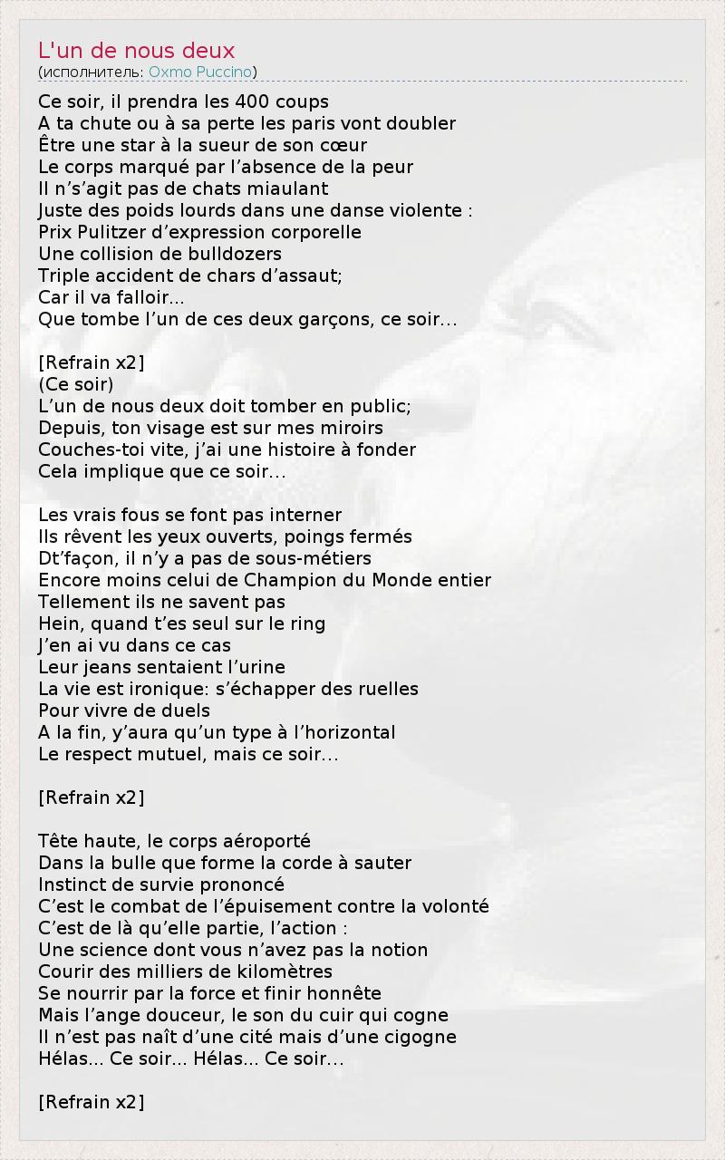Ce soir, il prendra les 400 coups A ta chute ou à sa perte les paris vont doubler Être une star à la sueur de son cœur Le corps marqué par l’absence de la peur Il n’s’agit pas de chats miaulant Juste des poids lourds dans une danse violente : Prix Pulitzer d’expression corporelle Une collision de bulldozers Triple accident de chars d’assaut; Car il va falloir... Que tombe l’un de ces deux garçons, ce soir… [Refrain x2] (Ce soir) L’un de nous deux doit tomber en public; Depuis, ton visage est sur mes miroirs Couches-toi vite, j’ai une histoire à fonder Cela implique que ce soir… Les vrais fous se font pas interner Ils rêvent les yeux ouverts, poings fermés Dt’façon, il n’y a pas de sous-métiers Encore moins celui de Champion du Monde entier Tellement ils ne savent pas Hein, quand t’es seul sur le ring J’en ai vu dans ce cas Leur jeans sentaient l’urine La vie est ironique: s’échapper des ruelles Pour vivre de duels A la fin, y’aura qu’un type à l’horizontal Le respect mutuel, mais ce soir… [Refrain x2] Tête haute, le corps aéroporté Dans la bulle que forme la corde à sauter Instinct de survie prononcé C’est le combat de l’épuisement contre la volonté C’est de là qu’elle partie, l’action : Une science dont vous n’avez pas la notion Courir des milliers de kilomètres Se nourrir par la force et finir honnête Mais l’ange douceur, le son du cuir qui cogne Il n’est pas naît d’une cité mais d’une cigogne Hélas... Ce soir... Hélas... Ce soir… [Refrain x2]