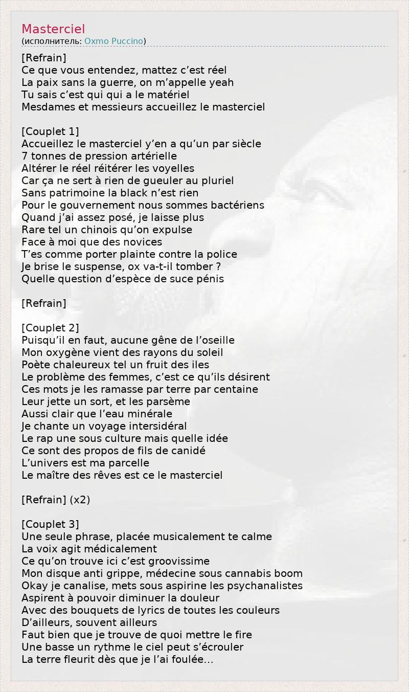 [Refrain] Ce que vous entendez, mattez c’est réel La paix sans la guerre, on m’appelle yeah Tu sais c’est qui qui a le matériel Mesdames et messieurs accueillez le masterciel [Couplet 1] Accueillez le masterciel y’en a qu’un par siècle 7 tonnes de pression artérielle Altérer le réel réitérer les voyelles Car ça ne sert à rien de gueuler au pluriel Sans patrimoine la black n’est rien Pour le gouvernement nous sommes bactériens Quand j’ai assez posé, je laisse plus Rare tel un chinois qu’on expulse Face à moi que des novices T’es comme porter plainte contre la police Je brise le suspense, ox va-t-il tomber ? Quelle question d’espèce de suce pénis [Refrain] [Couplet 2] Puisqu’il en faut, aucune gêne de l’oseille Mon oxygène vient des rayons du soleil Poète chaleureux tel un fruit des iles Le problème des femmes, c’est ce qu’ils désirent Ces mots je les ramasse par terre par centaine Leur jette un sort, et les parsème Aussi clair que l’eau minérale Je chante un voyage intersidéral Le rap une sous culture mais quelle idée Ce sont des propos de fils de canidé L’univers est ma parcelle Le maître des rêves est ce le masterciel [Refrain] (x2) [Couplet 3] Une seule phrase, placée musicalement te calme La voix agit médicalement Ce qu’on trouve ici c’est groovissime Mon disque anti grippe, médecine sous cannabis boom Okay je canalise, mets sous aspirine les psychanalistes Aspirent à pouvoir diminuer la douleur Avec des bouquets de lyrics de toutes les couleurs D’ailleurs, souvent ailleurs Faut bien que je trouve de quoi mettre le fire Une basse un rythme le ciel peut s’écrouler La terre fleurit dès que je l’ai foulée…