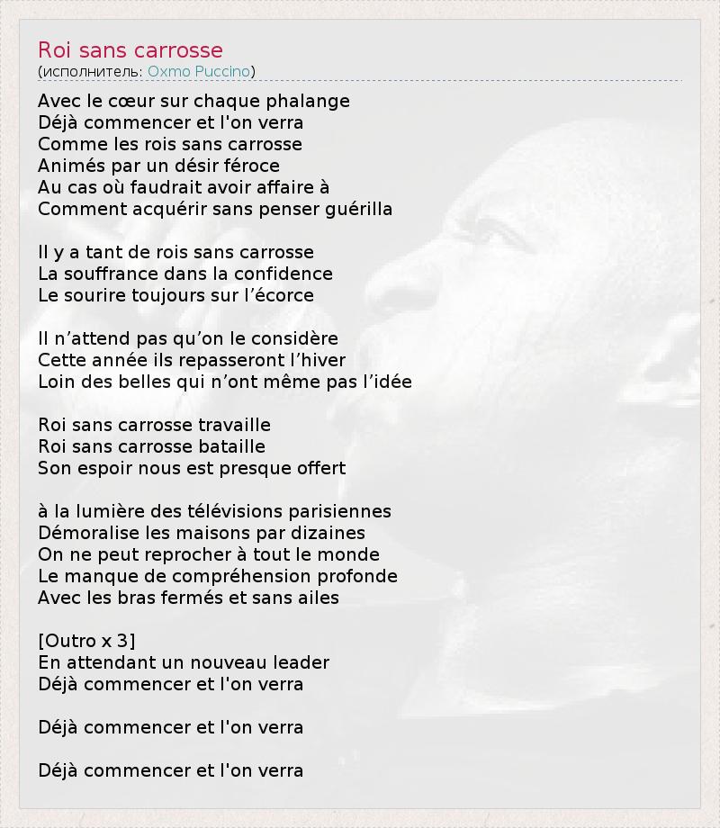Avec le cœur sur chaque phalange Déjà commencer et l'on verra Comme les rois sans carrosse Animés par un désir féroce Au cas où faudrait avoir affaire à Comment acquérir sans penser guérilla Il y a tant de rois sans carrosse La souffrance dans la confidence Le sourire toujours sur l’écorce Il n’attend pas qu’on le considère Cette année ils repasseront l’hiver Loin des belles qui n’ont même pas l’idée Roi sans carrosse travaille Roi sans carrosse bataille Son espoir nous est presque offert à la lumière des télévisions parisiennes Démoralise les maisons par dizaines On ne peut reprocher à tout le monde Le manque de compréhension profonde Avec les bras fermés et sans ailes [Outro x 3] En attendant un nouveau leader Déjà commencer et l'on verra Déjà commencer et l'on verra Déjà commencer et l'on verra