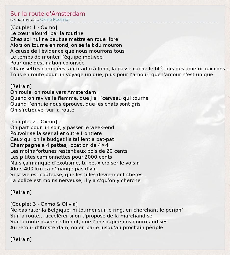 [Couplet 1 - Oxmo] Le cœur alourdi par la routine Chez soi nul ne peut se mettre en roue libre Alors on tourne en rond, on se fait du mouron A cause de l’évidence que nous mourrons tous Le temps de monter l’équipe motivée Pour une destination colorisée Chaussettes comblées, autoradio à fond, la passe cache le blé, lors des adieux aux cons… Tous en route pour un voyage unique, plus pour l’amour, que l’amour n’est unique [Refrain] On roule, on roule vers Amsterdam Quand on ravive la flamme, que j’ai l’cerveau qui tourne Quand l’ennuie nous éprouve, que les chats sont gris On s’retrouve, sur la route [Couplet 2 - Oxmo] On part pour un soir, y passer le week-end Pouvoir se laisser aller outre frontière Ceux qui on le budget ils taillent a pat-pat Champagne a 4 pattes, location de 4×4 Les moins fortunes restent aux bois de 20 cents Les p’tites camionnettes pour 2000 cents Mais ça manque d’exotisme, tu peux croiser le voisin Alors 400 km ca n’mange pas d’vin Si la vie est coûteuse, que les filles deviennent chères La police est moins nerveuse, il y a c’qu’on y cherche [Refrain] [Couplet 3 - Oxmo & Olivia] Ne pas rater la Belgique, ni tourner sur le ring, en cherchant le périph’ Sur la route… accélérer si on t’propose de la marchandise Sur la route ouvre ce hublot, que l’on soupire nos gourmandises Au retour d’Amsterdam, on en parle jusqu’au prochain périple [Refrain]