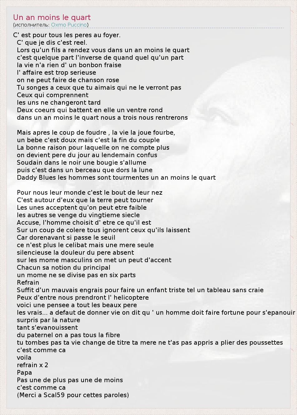 C' est pour tous les peres au foyer. C' que je dis c'est reel. Lors qu'un fils a rendez vous dans un an moins le quart c'est quelque part l'inverse de quand quel qu'un part la vie n'a rien d' un bonbon fraise l' affaire est trop serieuse on ne peut faire de chanson rose Tu songes a ceux que tu aimais qui ne le verront pas Ceux qui comprennent les uns ne changeront tard Deux coeurs qui battent en elle un ventre rond dans un an moins le quart nous a trois nous rentrerons Mais apres le coup de foudre , la vie la joue fourbe, un bebe c'est doux mais c'est la fin du couple La bonne raison pour laquelle on ne compte plus on devient pere du jour au lendemain confus Soudain dans le noir une bougie s'allume puis c'est dans un berceau que dors la lune Daddy Blues les hommes sont tourmentes un an moins le quart Pour nous leur monde c'est le bout de leur nez C'est autour d'eux que la terre peut tourner Les unes acceptent qu'on peut etre faible les autres se venge du vingtieme siecle Accuse, l'homme choisit d' etre ce qu'il est Sur un coup de colere tous ignorent ceux qu'ils laissent Car dorenavant si passe le seuil ce n'est plus le celibat mais une mere seule silencieuse la douleur du pere absent sur les mome masculins on met un peut d'accent Chacun sa notion du principal un mome ne se divise pas en six parts Refrain Suffit d'un mauvais engrais pour faire un enfant triste tel un tableau sans craie Peux d'entre nous prendront l' helicoptere voici une pensee a tout les beaux pere les vrais... a defaut de donner vie on dit qu ' un homme doit faire fortune pour s'epanouir surpris par la nature tant s'evanouissent du paternel on a pas tous la fibre tu tombes pas ta vie change de titre ta mere ne t'as pas appris a plier des poussettes c'est comme ca voila refrain x 2 Papa Pas une de plus pas une de moins c'est comme ca (Merci a Scal59 pour cettes paroles)