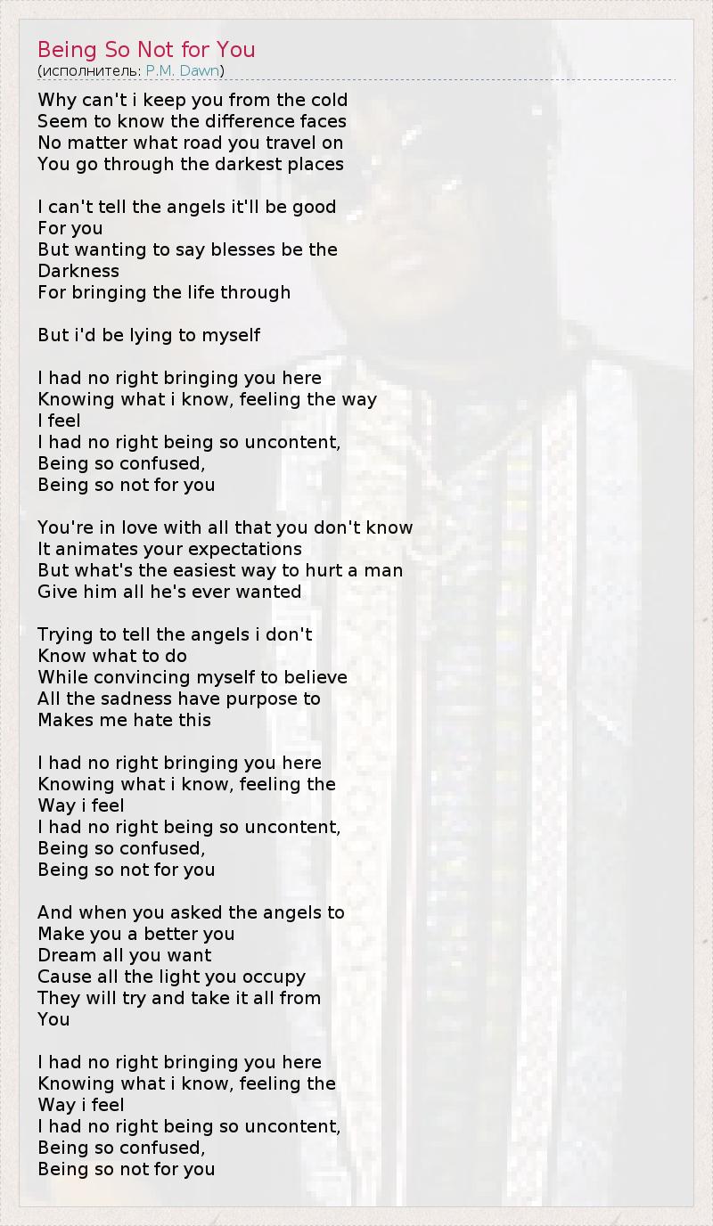 Why can't i keep you from the cold Seem to know the difference faces No matter what road you travel on You go through the darkest places I can't tell the angels it'll be good For you But wanting to say blesses be the Darkness For bringing the life through But i'd be lying to myself I had no right bringing you here Knowing what i know, feeling the way I feel I had no right being so uncontent, Being so confused, Being so not for you You're in love with all that you don't know It animates your expectations But what's the easiest way to hurt a man Give him all he's ever wanted Trying to tell the angels i don't Know what to do While convincing myself to believe All the sadness have purpose to Makes me hate this I had no right bringing you here Knowing what i know, feeling the Way i feel I had no right being so uncontent, Being so confused, Being so not for you And when you asked the angels to Make you a better you Dream all you want Cause all the light you occupy They will try and take it all from You I had no right bringing you here Knowing what i know, feeling the Way i feel I had no right being so uncontent, Being so confused, Being so not for you