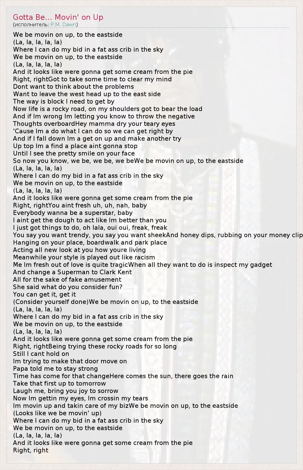 We be movin on up, to the eastside (La, la, la, la, la) Where I can do my bid in a fat ass crib in the sky We be movin on up, to the eastside (La, la, la, la, la) And it looks like were gonna get some cream from the pie Right, rightGot to take some time to clear my mind Dont want to think about the problems Want to leave the west head up to the east side The way is block I need to get by Now life is a rocky road, on my shoulders got to bear the load And if Im wrong Im letting you know to throw the negative Thoughts overboardHey mamma dry your teary eyes 'Cause Im a do what I can do so we can get right by And if I fall down Im a get on up and make another try Up top Im a find a place aint gonna stop Until I see the pretty smile on your face So now you know, we be, we be, we beWe be movin on up, to the eastside (La, la, la, la, la) Where I can do my bid in a fat ass crib in the sky We be movin on up, to the eastside (La, la, la, la, la) And it looks like were gonna get some cream from the pie Right, rightYou aint fresh uh, uh, nah, baby Everybody wanna be a superstar, baby I aint get the dough to act like Im better than you I just got things to do, oh lala, oui oui, freak, freak You say you want trendy, you say you want sheekAnd honey dips, rubbing on your money clip Hanging on your place, boardwalk and park place Acting all new look at you how youre living Meanwhile your style is played out like racism Me Im fresh out of love is quite tragicWhen all they want to do is inspect my gadget And change a Superman to Clark Kent All for the sake of fake amusement She said what do you consider fun? You can get it, get it (Consider yourself done)We be movin on up, to the eastside (La, la, la, la, la) Where I can do my bid in a fat ass crib in the sky We be movin on up, to the eastside (La, la, la, la, la) And it looks like were gonna get some cream from the pie Right, rightBeing trying these rocky roads for so long Still I cant hold on Im trying to make that door move on Papa told me to stay strong Time has come for that changeHere comes the sun, there goes the rain Take that first up to tomorrow Laugh me, bring you joy to sorrow Now Im gettin my eyes, Im crossin my tears Im movin up and takin care of my bizWe be movin on up, to the eastside (Looks like we be movin' up) Where I can do my bid in a fat ass crib in the sky We be movin on up, to the eastside (La, la, la, la, la) And it looks like were gonna get some cream from the pie Right, right