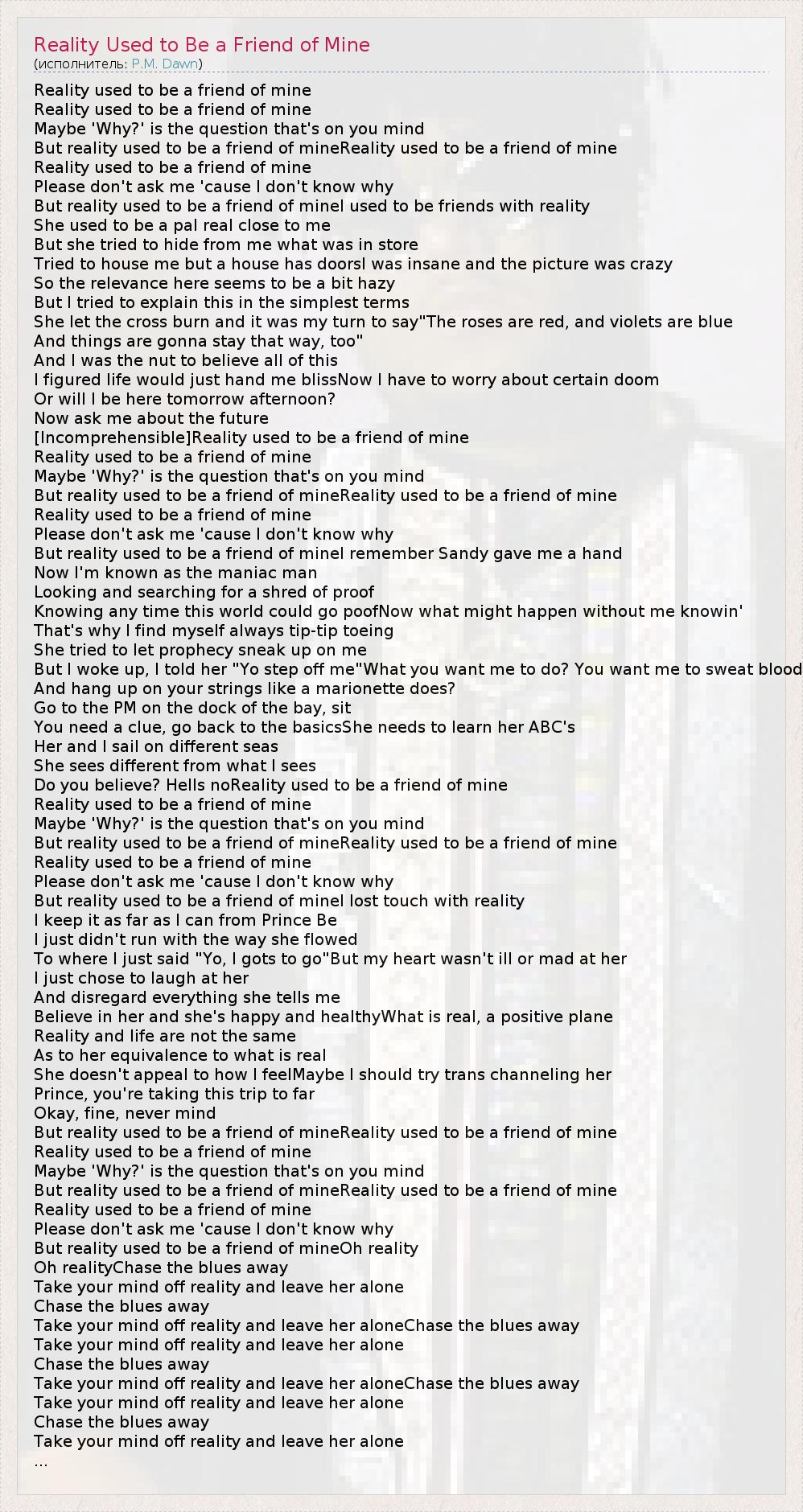 Reality used to be a friend of mine Reality used to be a friend of mine Maybe 'Why?' is the question that's on you mind But reality used to be a friend of mineReality used to be a friend of mine Reality used to be a friend of mine Please don't ask me 'cause I don't know why But reality used to be a friend of mineI used to be friends with reality She used to be a pal real close to me But she tried to hide from me what was in store Tried to house me but a house has doorsI was insane and the picture was crazy So the relevance here seems to be a bit hazy But I tried to explain this in the simplest terms She let the cross burn and it was my turn to say"The roses are red, and violets are blue And things are gonna stay that way, too" And I was the nut to believe all of this I figured life would just hand me blissNow I have to worry about certain doom Or will I be here tomorrow afternoon? Now ask me about the future [Incomprehensible]Reality used to be a friend of mine Reality used to be a friend of mine Maybe 'Why?' is the question that's on you mind But reality used to be a friend of mineReality used to be a friend of mine Reality used to be a friend of mine Please don't ask me 'cause I don't know why But reality used to be a friend of mineI remember Sandy gave me a hand Now I'm known as the maniac man Looking and searching for a shred of proof Knowing any time this world could go poofNow what might happen without me knowin' That's why I find myself always tip-tip toeing She tried to let prophecy sneak up on me But I woke up, I told her "Yo step off me"What you want me to do? You want me to sweat blood And hang up on your strings like a marionette does? Go to the PM on the dock of the bay, sit You need a clue, go back to the basicsShe needs to learn her ABC's Her and I sail on different seas She sees different from what I sees Do you believe? Hells noReality used to be a friend of mine Reality used to be a friend of mine Maybe 'Why?' is the question that's on you mind But reality used to be a friend of mineReality used to be a friend of mine Reality used to be a friend of mine Please don't ask me 'cause I don't know why But reality used to be a friend of mineI lost touch with reality I keep it as far as I can from Prince Be I just didn't run with the way she flowed To where I just said "Yo, I gots to go"But my heart wasn't ill or mad at her I just chose to laugh at her And disregard everything she tells me Believe in her and she's happy and healthyWhat is real, a positive plane Reality and life are not the same As to her equivalence to what is real She doesn't appeal to how I feelMaybe I should try trans channeling her Prince, you're taking this trip to far Okay, fine, never mind But reality used to be a friend of mineReality used to be a friend of mine Reality used to be a friend of mine Maybe 'Why?' is the question that's on you mind But reality used to be a friend of mineReality used to be a friend of mine Reality used to be a friend of mine Please don't ask me 'cause I don't know why But reality used to be a friend of mineOh reality Oh realityChase the blues away Take your mind off reality and leave her alone Chase the blues away Take your mind off reality and leave her aloneChase the blues away Take your mind off reality and leave her alone Chase the blues away Take your mind off reality and leave her aloneChase the blues away Take your mind off reality and leave her alone Chase the blues away Take your mind off reality and leave her alone ...