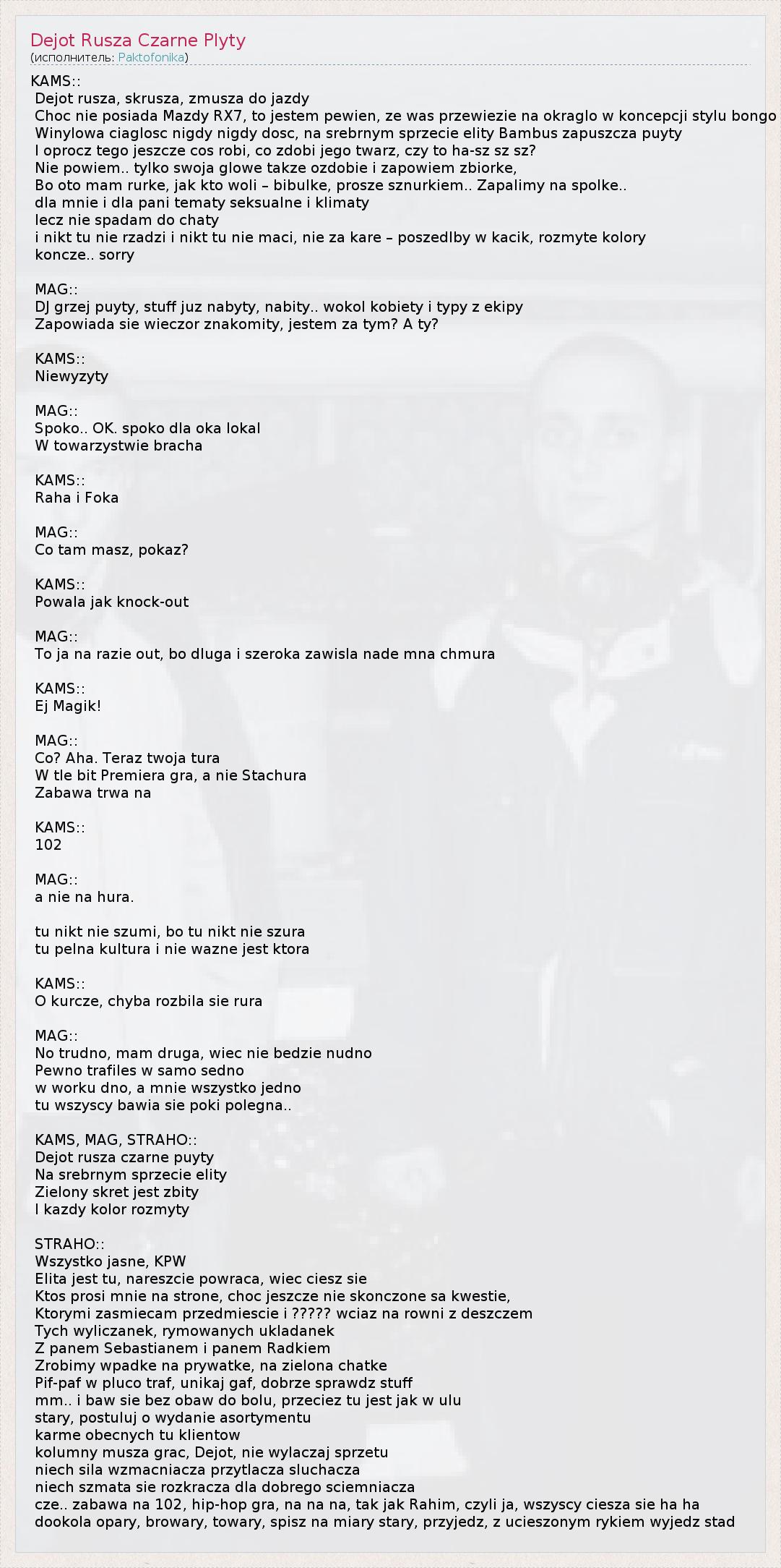 KAMS:: Dejot rusza, skrusza, zmusza do jazdy Choc nie posiada Mazdy RX7, to jestem pewien, ze was przewiezie na okraglo w koncepcji stylu bongo Winylowa ciaglosc nigdy nigdy dosc, na srebrnym sprzecie elity Bambus zapuszcza puyty I oprocz tego jeszcze cos robi, co zdobi jego twarz, czy to ha-sz sz sz? Nie powiem.. tylko swoja glowe takze ozdobie i zapowiem zbiorke, Bo oto mam rurke, jak kto woli – bibulke, prosze sznurkiem.. Zapalimy na spolke.. dla mnie i dla pani tematy seksualne i klimaty lecz nie spadam do chaty i nikt tu nie rzadzi i nikt tu nie maci, nie za kare – poszedlby w kacik, rozmyte kolory koncze.. sorry MAG:: DJ grzej puyty, stuff juz nabyty, nabity.. wokol kobiety i typy z ekipy Zapowiada sie wieczor znakomity, jestem za tym? A ty? KAMS:: Niewyzyty MAG:: Spoko.. OK. spoko dla oka lokal W towarzystwie bracha KAMS:: Raha i Foka MAG:: Co tam masz, pokaz? KAMS:: Powala jak knock-out MAG:: To ja na razie out, bo dluga i szeroka zawisla nade mna chmura KAMS:: Ej Magik! MAG:: Co? Aha. Teraz twoja tura W tle bit Premiera gra, a nie Stachura Zabawa trwa na KAMS:: 102 MAG:: a nie na hura. tu nikt nie szumi, bo tu nikt nie szura tu pelna kultura i nie wazne jest ktora KAMS:: O kurcze, chyba rozbila sie rura MAG:: No trudno, mam druga, wiec nie bedzie nudno Pewno trafiles w samo sedno w worku dno, a mnie wszystko jedno tu wszyscy bawia sie poki polegna.. KAMS, MAG, STRAHO:: Dejot rusza czarne puyty Na srebrnym sprzecie elity Zielony skret jest zbity I kazdy kolor rozmyty STRAHO:: Wszystko jasne, KPW Elita jest tu, nareszcie powraca, wiec ciesz sie Ktos prosi mnie na strone, choc jeszcze nie skonczone sa kwestie, Ktorymi zasmiecam przedmiescie i ????? wciaz na rowni z deszczem Tych wyliczanek, rymowanych ukladanek Z panem Sebastianem i panem Radkiem Zrobimy wpadke na prywatke, na zielona chatke Pif-paf w pluco traf, unikaj gaf, dobrze sprawdz stuff mm.. i baw sie bez obaw do bolu, przeciez tu jest jak w ulu stary, postuluj o wydanie asortymentu karme obecnych tu klientow kolumny musza grac, Dejot, nie wylaczaj sprzetu niech sila wzmacniacza przytlacza sluchacza niech szmata sie rozkracza dla dobrego sciemniacza cze.. zabawa na 102, hip-hop gra, na na na, tak jak Rahim, czyli ja, wszyscy ciesza sie ha ha dookola opary, browary, towary, spisz na miary stary, przyjedz, z ucieszonym rykiem wyjedz stad