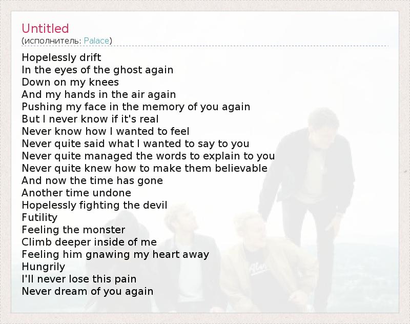 Hopelessly drift In the eyes of the ghost again Down on my knees And my hands in the air again Pushing my face in the memory of you again But I never know if it's real Never know how I wanted to feel Never quite said what I wanted to say to you Never quite managed the words to explain to you Never quite knew how to make them believable And now the time has gone Another time undone Hopelessly fighting the devil Futility Feeling the monster Climb deeper inside of me Feeling him gnawing my heart away Hungrily I'll never lose this pain Never dream of you again