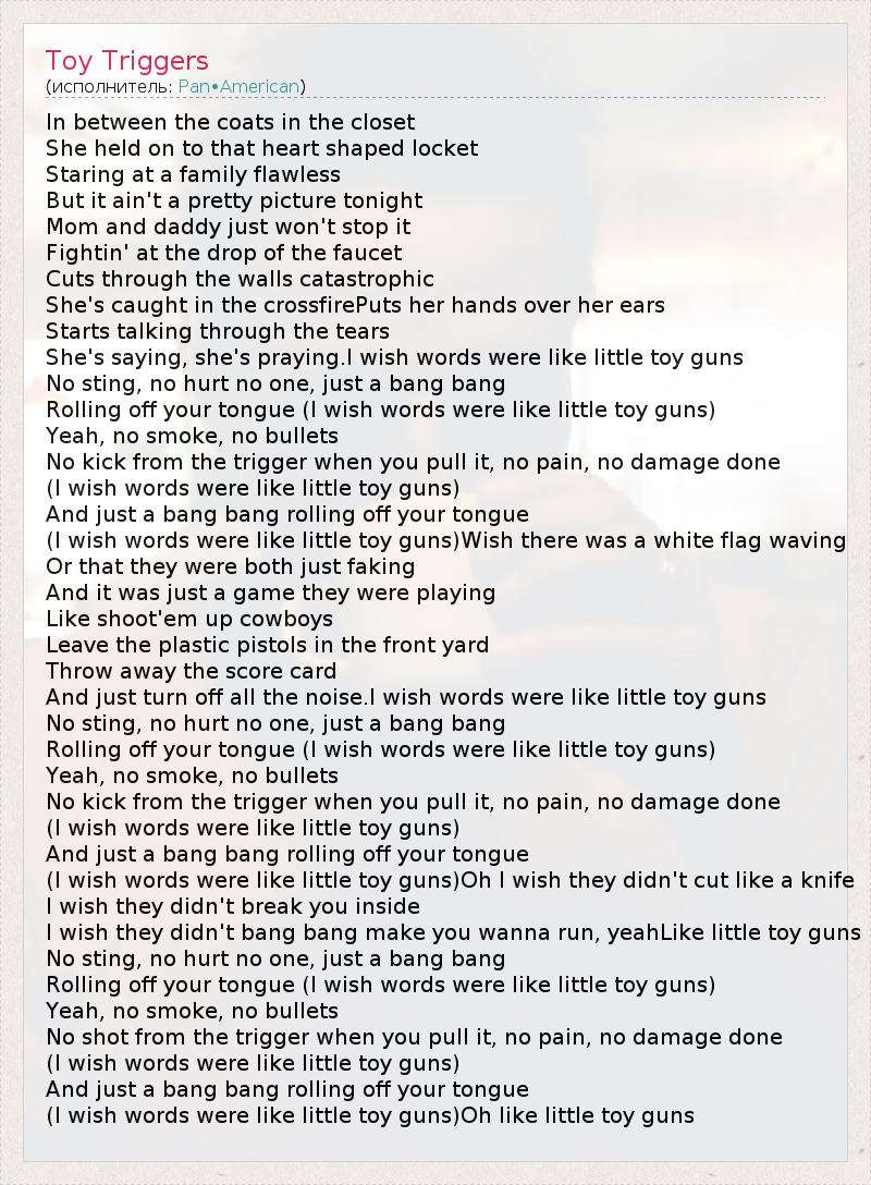 In between the coats in the closet She held on to that heart shaped locket Staring at a family flawless But it ain't a pretty picture tonight Mom and daddy just won't stop it Fightin' at the drop of the faucet Cuts through the walls catastrophic She's caught in the crossfirePuts her hands over her ears Starts talking through the tears She's saying, she's praying.I wish words were like little toy guns No sting, no hurt no one, just a bang bang Rolling off your tongue (I wish words were like little toy guns) Yeah, no smoke, no bullets No kick from the trigger when you pull it, no pain, no damage done (I wish words were like little toy guns) And just a bang bang rolling off your tongue (I wish words were like little toy guns)Wish there was a white flag waving Or that they were both just faking And it was just a game they were playing Like shoot'em up cowboys Leave the plastic pistols in the front yard Throw away the score card And just turn off all the noise.I wish words were like little toy guns No sting, no hurt no one, just a bang bang Rolling off your tongue (I wish words were like little toy guns) Yeah, no smoke, no bullets No kick from the trigger when you pull it, no pain, no damage done (I wish words were like little toy guns) And just a bang bang rolling off your tongue (I wish words were like little toy guns)Oh I wish they didn't cut like a knife I wish they didn't break you inside I wish they didn't bang bang make you wanna run, yeahLike little toy guns No sting, no hurt no one, just a bang bang Rolling off your tongue (I wish words were like little toy guns) Yeah, no smoke, no bullets No shot from the trigger when you pull it, no pain, no damage done (I wish words were like little toy guns) And just a bang bang rolling off your tongue (I wish words were like little toy guns)Oh like little toy guns