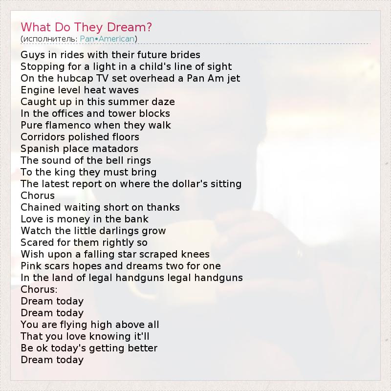 Guys in rides with their future brides Stopping for a light in a child's line of sight On the hubcap TV set overhead a Pan Am jet Engine level heat waves Caught up in this summer daze In the offices and tower blocks Pure flamenco when they walk Corridors polished floors Spanish place matadors The sound of the bell rings To the king they must bring The latest report on where the dollar's sitting Chorus Chained waiting short on thanks Love is money in the bank Watch the little darlings grow Scared for them rightly so Wish upon a falling star scraped knees Pink scars hopes and dreams two for one In the land of legal handguns legal handguns Chorus: Dream today Dream today You are flying high above all That you love knowing it'll Be ok today's getting better Dream today