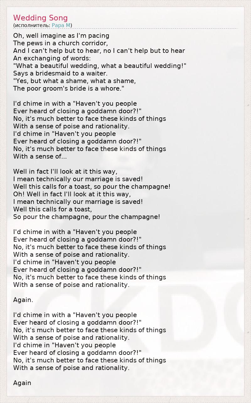 Oh, well imagine as I'm pacing The pews in a church corridor, And I can't help but to hear, no I can't help but to hear An exchanging of words: "What a beautiful wedding, what a beautiful wedding!" Says a bridesmaid to a waiter. "Yes, but what a shame, what a shame, The poor groom's bride is a whore." I'd chime in with a "Haven't you people Ever heard of closing a goddamn door?!" No, it's much better to face these kinds of things With a sense of poise and rationality. I'd chime in "Haven't you people Ever heard of closing a goddamn door?!" No, it's much better to face these kinds of things With a sense of... Well in fact I'll look at it this way, I mean technically our marriage is saved! Well this calls for a toast, so pour the champagne! Oh! Well in fact I'll look at it this way, I mean technically our marriage is saved! Well this calls for a toast, So pour the champagne, pour the champagne! I'd chime in with a "Haven't you people Ever heard of closing a goddamn door?!" No, it's much better to face these kinds of things With a sense of poise and rationality. I'd chime in "Haven't you people Ever heard of closing a goddamn door?!" No, it's much better to face these kinds of things With a sense of poise and rationality. Again. I'd chime in with a "Haven't you people Ever heard of closing a goddamn door?!" No, it's much better to face these kinds of things With a sense of poise and rationality. I'd chime in "Haven't you people Ever heard of closing a goddamn door?!" No, it's much better to face these kinds of things With a sense of poise and rationality. Again