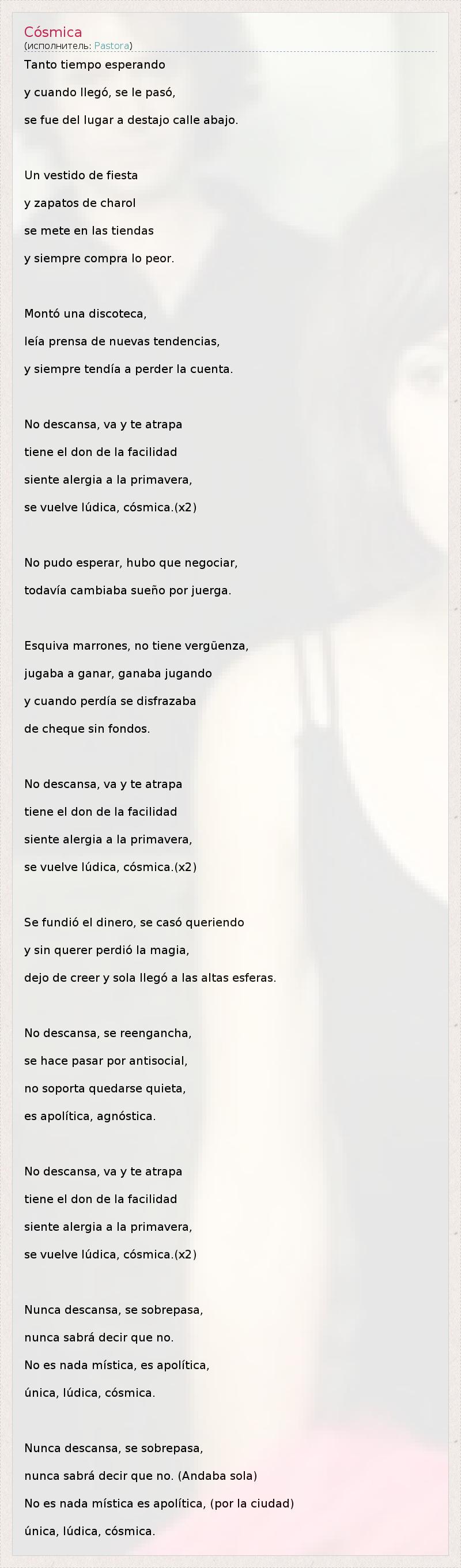 Tanto tiempo esperando y cuando llegó, se le pasó, se fue del lugar a destajo calle abajo. Un vestido de fiesta y zapatos de charol se mete en las tiendas y siempre compra lo peor. Montó una discoteca, leía prensa de nuevas tendencias, y siempre tendía a perder la cuenta. No descansa, va y te atrapa tiene el don de la facilidad siente alergia a la primavera, se vuelve lúdica, cósmica.(x2) No pudo esperar, hubo que negociar, todavía cambiaba sueño por juerga. Esquiva marrones, no tiene vergüenza, jugaba a ganar, ganaba jugando y cuando perdía se disfrazaba de cheque sin fondos. No descansa, va y te atrapa tiene el don de la facilidad siente alergia a la primavera, se vuelve lúdica, cósmica.(x2) Se fundió el dinero, se casó queriendo y sin querer perdió la magia, dejo de creer y sola llegó a las altas esferas. No descansa, se reengancha, se hace pasar por antisocial, no soporta quedarse quieta, es apolítica, agnóstica. No descansa, va y te atrapa tiene el don de la facilidad siente alergia a la primavera, se vuelve lúdica, cósmica.(x2) Nunca descansa, se sobrepasa, nunca sabrá decir que no. No es nada mística, es apolítica, única, lúdica, cósmica. Nunca descansa, se sobrepasa, nunca sabrá decir que no. (Andaba sola) No es nada mística es apolítica, (por la ciudad) única, lúdica, cósmica.