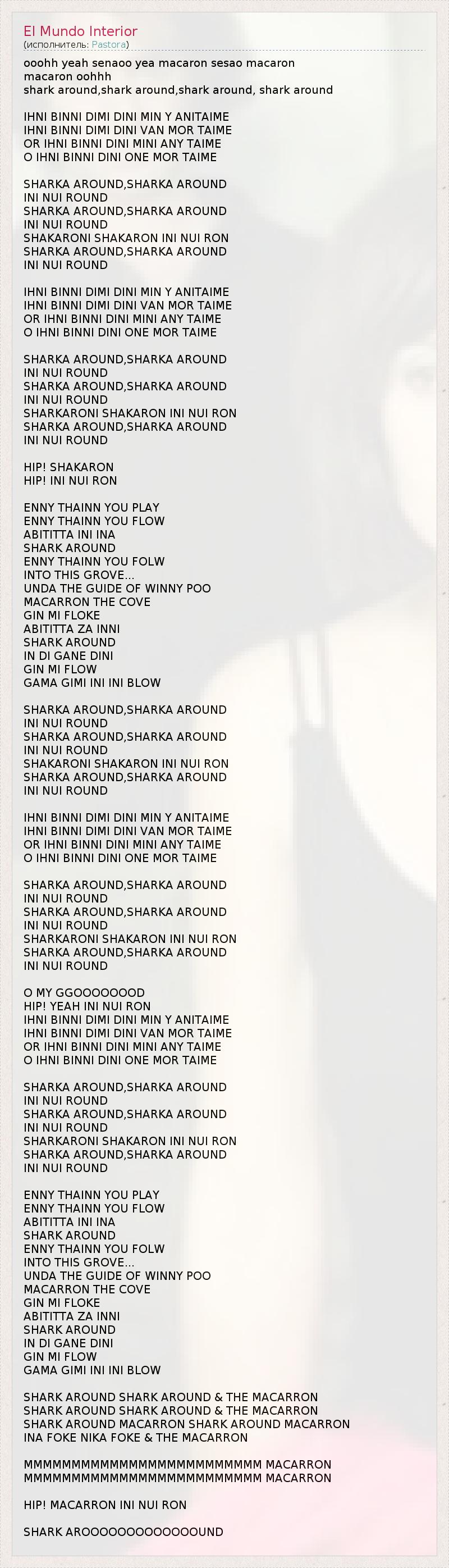 ooohh yeah senaoo yea macaron sesao macaron macaron oohhh shark around,shark around,shark around, shark around IHNI BINNI DIMI DINI MIN Y ANITAIME IHNI BINNI DIMI DINI VAN MOR TAIME OR IHNI BINNI DINI MINI ANY TAIME O IHNI BINNI DINI ONE MOR TAIME SHARKA AROUND,SHARKA AROUND INI NUI ROUND SHARKA AROUND,SHARKA AROUND INI NUI ROUND SHAKARONI SHAKARON INI NUI RON SHARKA AROUND,SHARKA AROUND INI NUI ROUND IHNI BINNI DIMI DINI MIN Y ANITAIME IHNI BINNI DIMI DINI VAN MOR TAIME OR IHNI BINNI DINI MINI ANY TAIME O IHNI BINNI DINI ONE MOR TAIME SHARKA AROUND,SHARKA AROUND INI NUI ROUND SHARKA AROUND,SHARKA AROUND INI NUI ROUND SHARKARONI SHAKARON INI NUI RON SHARKA AROUND,SHARKA AROUND INI NUI ROUND HIP! SHAKARON HIP! INI NUI RON ENNY THAINN YOU PLAY ENNY THAINN YOU FLOW ABITITTA INI INA SHARK AROUND ENNY THAINN YOU FOLW INTO THIS GROVE... UNDA THE GUIDE OF WINNY POO MACARRON THE COVE GIN MI FLOKE ABITITTA ZA INNI SHARK AROUND IN DI GANE DINI GIN MI FLOW GAMA GIMI INI INI BLOW SHARKA AROUND,SHARKA AROUND INI NUI ROUND SHARKA AROUND,SHARKA AROUND INI NUI ROUND SHAKARONI SHAKARON INI NUI RON SHARKA AROUND,SHARKA AROUND INI NUI ROUND IHNI BINNI DIMI DINI MIN Y ANITAIME IHNI BINNI DIMI DINI VAN MOR TAIME OR IHNI BINNI DINI MINI ANY TAIME O IHNI BINNI DINI ONE MOR TAIME SHARKA AROUND,SHARKA AROUND INI NUI ROUND SHARKA AROUND,SHARKA AROUND INI NUI ROUND SHARKARONI SHAKARON INI NUI RON SHARKA AROUND,SHARKA AROUND INI NUI ROUND O MY GGOOOOOOOD HIP! YEAH INI NUI RON IHNI BINNI DIMI DINI MIN Y ANITAIME IHNI BINNI DIMI DINI VAN MOR TAIME OR IHNI BINNI DINI MINI ANY TAIME O IHNI BINNI DINI ONE MOR TAIME SHARKA AROUND,SHARKA AROUND INI NUI ROUND SHARKA AROUND,SHARKA AROUND INI NUI ROUND SHARKARONI SHAKARON INI NUI RON SHARKA AROUND,SHARKA AROUND INI NUI ROUND ENNY THAINN YOU PLAY ENNY THAINN YOU FLOW ABITITTA INI INA SHARK AROUND ENNY THAINN YOU FOLW INTO THIS GROVE... UNDA THE GUIDE OF WINNY POO MACARRON THE COVE GIN MI FLOKE ABITITTA ZA INNI SHARK AROUND IN DI GANE DINI GIN MI FLOW GAMA GIMI INI INI BLOW SHARK AROUND SHARK AROUND & THE MACARRON SHARK AROUND SHARK AROUND & THE MACARRON SHARK AROUND MACARRON SHARK AROUND MACARRON INA FOKE NIKA FOKE & THE MACARRON MMMMMMMMMMMMMMMMMMMMMMMMM MACARRON MMMMMMMMMMMMMMMMMMMMMMMMM MACARRON HIP! MACARRON INI NUI RON SHARK AROOOOOOOOOOOOOUND