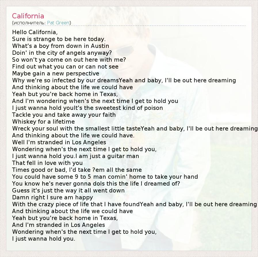 Hello California, Sure is strange to be here today. What's a boy from down in Austin Doin' in the city of angels anyway? So won't ya come on out here with me? Find out what you can or can not see Maybe gain a new perspective Why we're so infected by our dreamsYeah and baby, I'll be out here dreaming And thinking about the life we could have Yeah but you're back home in Texas, And I'm wondering when's the next time I get to hold you I just wanna hold youIt's the sweetest kind of poison Tackle you and take away your faith Whiskey for a lifetime Wreck your soul with the smallest little tasteYeah and baby, I'll be out here dreaming And thinking about the life we could have. Well I'm stranded in Los Angeles Wondering when's the next time I get to hold you, I just wanna hold you.I am just a guitar man That fell in love with you Times good or bad, I'd take ?em all the same You could have some 9 to 5 man comin' home to take your hand You know he's never gonna doIs this the life I dreamed of? Guess it's just the way it all went down Damn right I sure am happy With the crazy piece of life that I have foundYeah and baby, I'll be out here dreaming And thinking about the life we could have Yeah but you're back home in Texas, And I'm stranded in Los Angeles Wondering when's the next time I get to hold you, I just wanna hold you.
