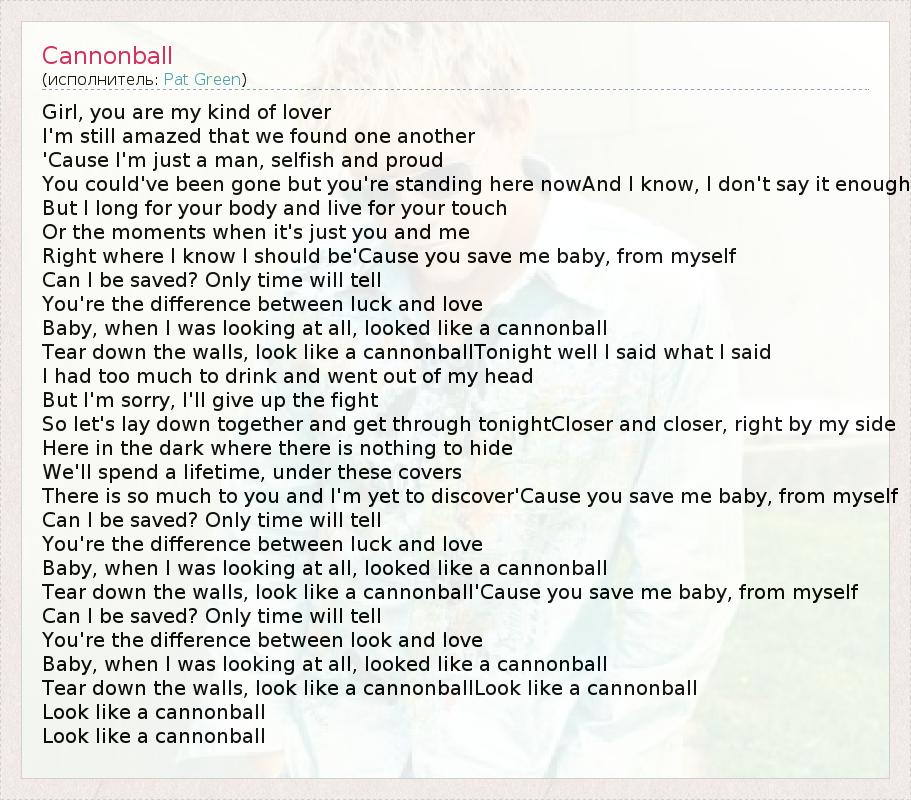 Girl, you are my kind of lover I'm still amazed that we found one another 'Cause I'm just a man, selfish and proud You could've been gone but you're standing here nowAnd I know, I don't say it enough But I long for your body and live for your touch Or the moments when it's just you and me Right where I know I should be'Cause you save me baby, from myself Can I be saved? Only time will tell You're the difference between luck and love Baby, when I was looking at all, looked like a cannonball Tear down the walls, look like a cannonballTonight well I said what I said I had too much to drink and went out of my head But I'm sorry, I'll give up the fight So let's lay down together and get through tonightCloser and closer, right by my side Here in the dark where there is nothing to hide We'll spend a lifetime, under these covers There is so much to you and I'm yet to discover'Cause you save me baby, from myself Can I be saved? Only time will tell You're the difference between luck and love Baby, when I was looking at all, looked like a cannonball Tear down the walls, look like a cannonball'Cause you save me baby, from myself Can I be saved? Only time will tell You're the difference between look and love Baby, when I was looking at all, looked like a cannonball Tear down the walls, look like a cannonballLook like a cannonball Look like a cannonball Look like a cannonball