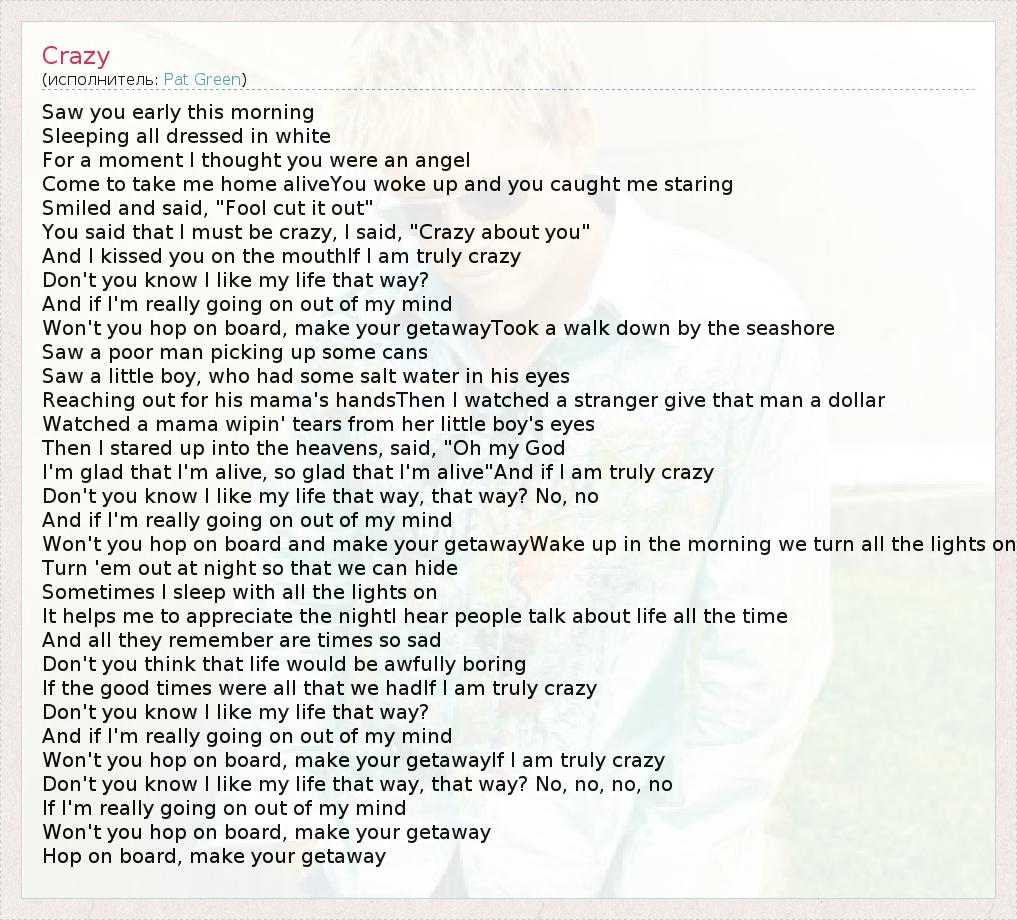 Saw you early this morning Sleeping all dressed in white For a moment I thought you were an angel Come to take me home aliveYou woke up and you caught me staring Smiled and said, "Fool cut it out" You said that I must be crazy, I said, "Crazy about you" And I kissed you on the mouthIf I am truly crazy Don't you know I like my life that way? And if I'm really going on out of my mind Won't you hop on board, make your getawayTook a walk down by the seashore Saw a poor man picking up some cans Saw a little boy, who had some salt water in his eyes Reaching out for his mama's handsThen I watched a stranger give that man a dollar Watched a mama wipin' tears from her little boy's eyes Then I stared up into the heavens, said, "Oh my God I'm glad that I'm alive, so glad that I'm alive"And if I am truly crazy Don't you know I like my life that way, that way? No, no And if I'm really going on out of my mind Won't you hop on board and make your getawayWake up in the morning we turn all the lights on Turn 'em out at night so that we can hide Sometimes I sleep with all the lights on It helps me to appreciate the nightI hear people talk about life all the time And all they remember are times so sad Don't you think that life would be awfully boring If the good times were all that we hadIf I am truly crazy Don't you know I like my life that way? And if I'm really going on out of my mind Won't you hop on board, make your getawayIf I am truly crazy Don't you know I like my life that way, that way? No, no, no, no If I'm really going on out of my mind Won't you hop on board, make your getaway Hop on board, make your getaway