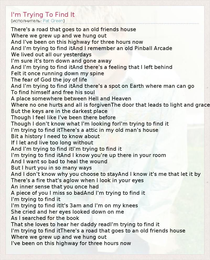 There's a road that goes to an old friends house Where we grew up and we hung out And I've been on this highway for three hours now And I'm trying to find itAnd I remember an old Pinball Arcade We lived out all our yesterdays I'm sure it's torn down and gone away And I'm trying to find itAnd there's a feeling that I left behind Felt it once running down my spine The fear of God the joy of life And I'm trying to find itAnd there's a spot on Earth where man can go To find himself and free his soul A place somewhere between Hell and Heaven Where no one hurts and all is forgivenThe door that leads to light and grace But the keys are in the darkest place Though I feel like I've been there before Though I don't know what I'm looking forI'm trying to find it I'm trying to find itThere's a attic in my old man's house Bit a history I need to know about If I let and live too long without And I'm trying to find itI'm trying to find it I'm trying to find itAnd I know you're up there in your room And I want so bad to heal the wound But I hurt you in so many ways And I don't know why you choose to stayAnd I know it's me that let it by There's a fire that's aglow when I look in your eyes An inner sense that you once had A piece of you I miss so badAnd I'm trying to find it I'm trying to find it I'm trying to find itIt's 3am and I'm on my knees She cried and her eyes looked down on me As I searched for the book That she loves to hear her daddy readI'm trying to find it I'm trying to find itThere's a road that goes to an old friends house Where we grew up and we hung out I've been on this highway for three hours now