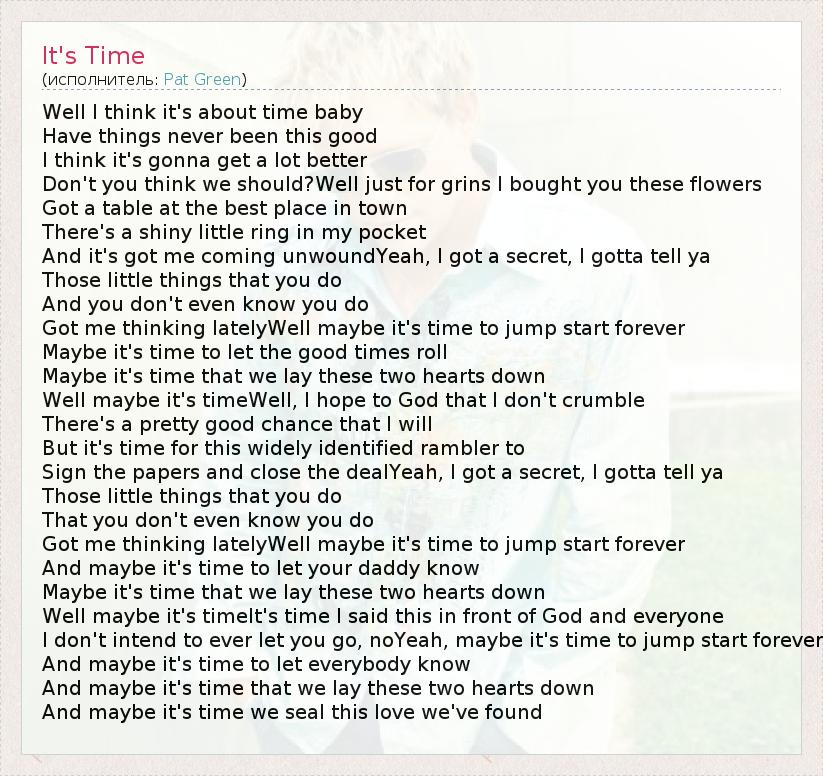 Well I think it's about time baby Have things never been this good I think it's gonna get a lot better Don't you think we should?Well just for grins I bought you these flowers Got a table at the best place in town There's a shiny little ring in my pocket And it's got me coming unwoundYeah, I got a secret, I gotta tell ya Those little things that you do And you don't even know you do Got me thinking latelyWell maybe it's time to jump start forever Maybe it's time to let the good times roll Maybe it's time that we lay these two hearts down Well maybe it's timeWell, I hope to God that I don't crumble There's a pretty good chance that I will But it's time for this widely identified rambler to Sign the papers and close the dealYeah, I got a secret, I gotta tell ya Those little things that you do That you don't even know you do Got me thinking latelyWell maybe it's time to jump start forever And maybe it's time to let your daddy know Maybe it's time that we lay these two hearts down Well maybe it's timeIt's time I said this in front of God and everyone I don't intend to ever let you go, noYeah, maybe it's time to jump start forever And maybe it's time to let everybody know And maybe it's time that we lay these two hearts down And maybe it's time we seal this love we've found