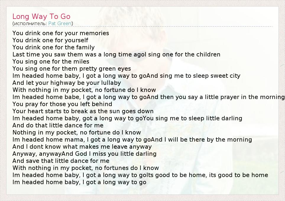 You drink one for your memories You drink one for yourself You drink one for the family Last time you saw them was a long time agoI sing one for the children You sing one for the miles You sing one for them pretty green eyes Im headed home baby, I got a long way to goAnd sing me to sleep sweet city And let your highway be your lullaby With nothing in my pocket, no fortune do I know Im headed home babe, I got a long way to goAnd then you say a little prayer in the morning You pray for those you left behind Your heart starts to break as the sun goes down Im headed home baby, got a long way to goYou sing me to sleep little darling And do that little dance for me Nothing in my pocket, no fortune do I know Im headed home mama, I got a long way to goAnd I will be there by the morning And I dont know what makes me leave anyway Anyway, anywayAnd God I miss you little darling And save that little dance for me With nothing in my pocket, no fortunes do I know Im headed home baby, I got a long way to goIts good to be home, its good to be home Im headed home baby, I got a long way to go
