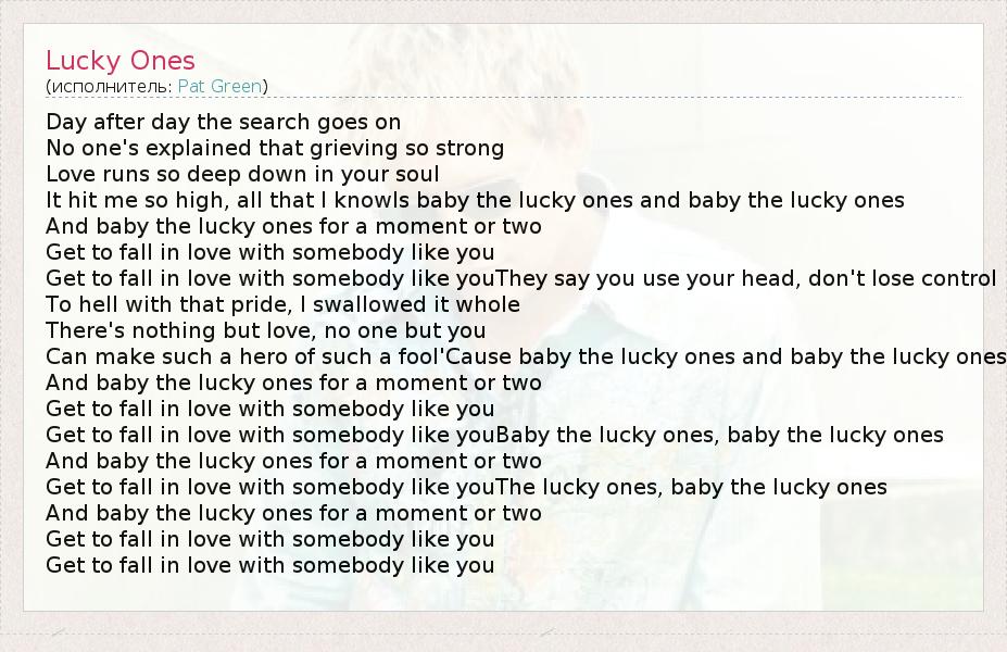 Day after day the search goes on No one's explained that grieving so strong Love runs so deep down in your soul It hit me so high, all that I knowIs baby the lucky ones and baby the lucky ones And baby the lucky ones for a moment or two Get to fall in love with somebody like you Get to fall in love with somebody like youThey say you use your head, don't lose control To hell with that pride, I swallowed it whole There's nothing but love, no one but you Can make such a hero of such a fool'Cause baby the lucky ones and baby the lucky ones And baby the lucky ones for a moment or two Get to fall in love with somebody like you Get to fall in love with somebody like youBaby the lucky ones, baby the lucky ones And baby the lucky ones for a moment or two Get to fall in love with somebody like youThe lucky ones, baby the lucky ones And baby the lucky ones for a moment or two Get to fall in love with somebody like you Get to fall in love with somebody like you