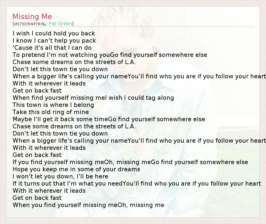I wish I could hold you back I know I can't help you pack 'Cause it's all that I can do To pretend I'm not watching youGo find yourself somewhere else Chase some dreams on the streets of L.A. Don't let this town tie you down When a bigger life's calling your nameYou'll find who you are if you follow your heart With it wherever it leads Get on back fast When find yourself missing meI wish I could tag along This town is where I belong Take this old ring of mine Maybe I'll get it back some timeGo find yourself somewhere else Chase some dreams on the streets of L.A. Don't let this town tie you down When a bigger life's calling your nameYou'll find who you are if you follow your heart With it wherever it leads Get on back fast If you find yourself missing meOh, missing meGo find yourself somewhere else Hope you keep me in some of your dreams I won't let you down, I'll be here If it turns out that I'm what you needYou'll find who you are if you follow your heart With it wherever it leads Get on back fast When you find yourself missing meOh, missing me