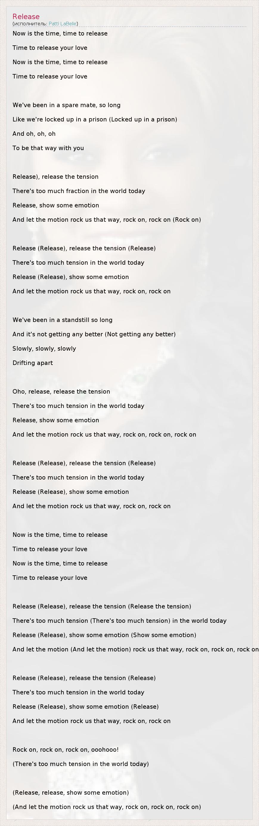 Now is the time, time to release Time to release your love Now is the time, time to release Time to release your love We've been in a spare mate, so long Like we're locked up in a prison (Locked up in a prison) And oh, oh, oh To be that way with you Release), release the tension There's too much fraction in the world today Release, show some emotion And let the motion rock us that way, rock on, rock on (Rock on) Release (Release), release the tension (Release) There's too much tension in the world today Release (Release), show some emotion And let the motion rock us that way, rock on, rock on We've been in a standstill so long And it's not getting any better (Not getting any better) Slowly, slowly, slowly Drifting apart Oho, release, release the tension There's too much tension in the world today Release, show some emotion And let the motion rock us that way, rock on, rock on, rock on Release (Release), release the tension (Release) There's too much tension in the world today Release (Release), show some emotion And let the motion rock us that way, rock on, rock on Now is the time, time to release Time to release your love Now is the time, time to release Time to release your love Release (Release), release the tension (Release the tension) There's too much tension (There's too much tension) in the world today Release (Release), show some emotion (Show some emotion) And let the motion (And let the motion) rock us that way, rock on, rock on, rock on Release (Release), release the tension (Release) There's too much tension in the world today Release (Release), show some emotion (Release) And let the motion rock us that way, rock on, rock on Rock on, rock on, rock on, ooohooo! (There's too much tension in the world today) (Release, release, show some emotion) (And let the motion rock us that way, rock on, rock on, rock on)