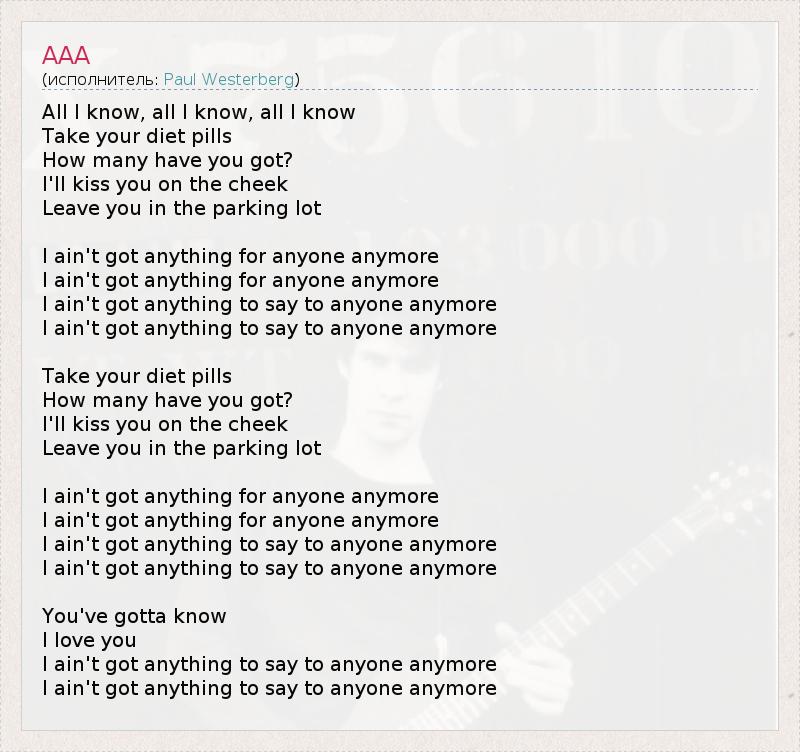 All I know, all I know, all I know Take your diet pills How many have you got? I'll kiss you on the cheek Leave you in the parking lot I ain't got anything for anyone anymore I ain't got anything for anyone anymore I ain't got anything to say to anyone anymore I ain't got anything to say to anyone anymore Take your diet pills How many have you got? I'll kiss you on the cheek Leave you in the parking lot I ain't got anything for anyone anymore I ain't got anything for anyone anymore I ain't got anything to say to anyone anymore I ain't got anything to say to anyone anymore You've gotta know I love you I ain't got anything to say to anyone anymore I ain't got anything to say to anyone anymore