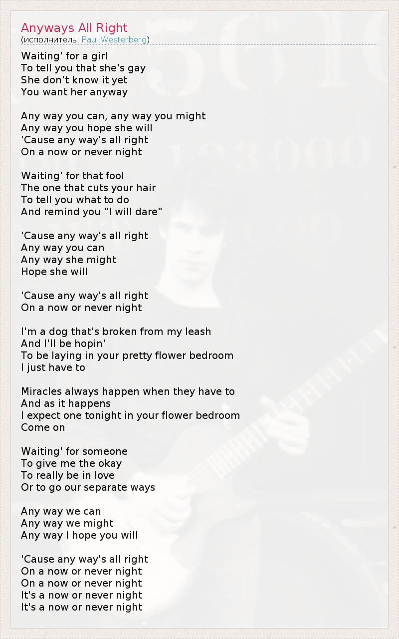 Waiting' for a girl To tell you that she's gay She don't know it yet You want her anyway Any way you can, any way you might Any way you hope she will 'Cause any way's all right On a now or never night Waiting' for that fool The one that cuts your hair To tell you what to do And remind you "I will dare" 'Cause any way's all right Any way you can Any way she might Hope she will 'Cause any way's all right On a now or never night I'm a dog that's broken from my leash And I'll be hopin' To be laying in your pretty flower bedroom I just have to Miracles always happen when they have to And as it happens I expect one tonight in your flower bedroom Come on Waiting' for someone To give me the okay To really be in love Or to go our separate ways Any way we can Any way we might Any way I hope you will 'Cause any way's all right On a now or never night On a now or never night It's a now or never night It's a now or never night