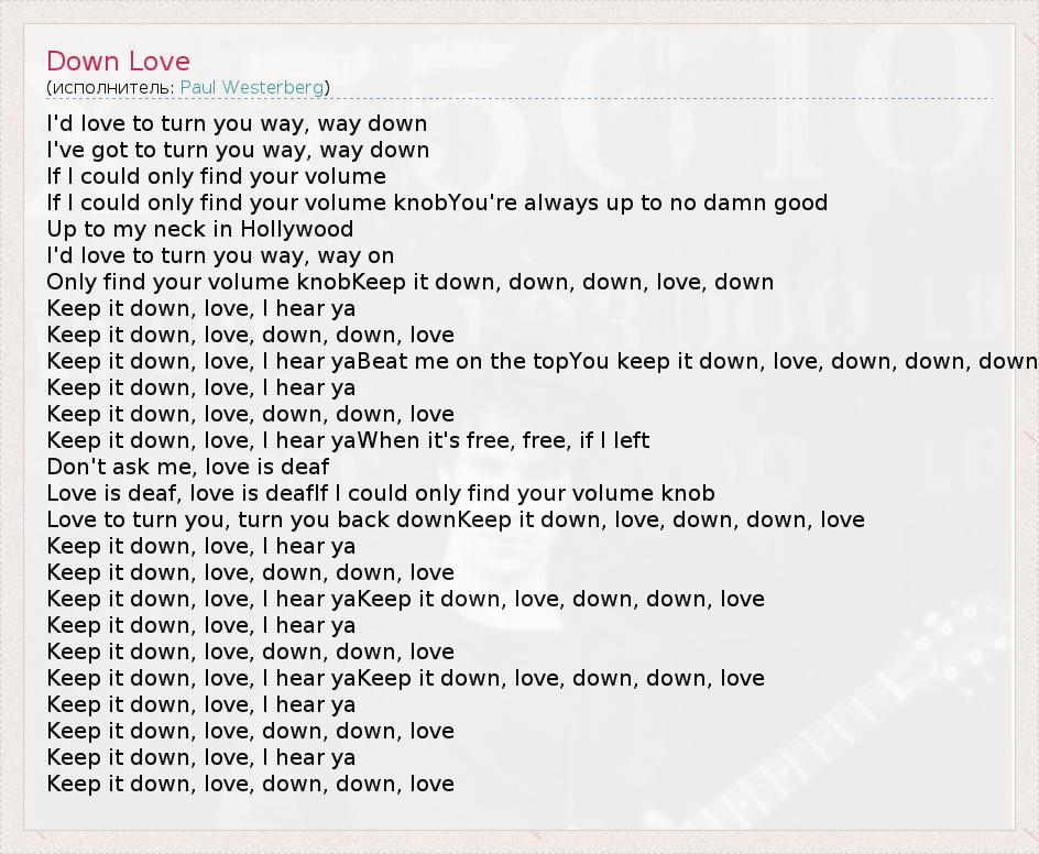 I'd love to turn you way, way down I've got to turn you way, way down If I could only find your volume If I could only find your volume knobYou're always up to no damn good Up to my neck in Hollywood I'd love to turn you way, way on Only find your volume knobKeep it down, down, down, love, down Keep it down, love, I hear ya Keep it down, love, down, down, love Keep it down, love, I hear yaBeat me on the topYou keep it down, love, down, down, down Keep it down, love, I hear ya Keep it down, love, down, down, love Keep it down, love, I hear yaWhen it's free, free, if I left Don't ask me, love is deaf Love is deaf, love is deafIf I could only find your volume knob Love to turn you, turn you back downKeep it down, love, down, down, love Keep it down, love, I hear ya Keep it down, love, down, down, love Keep it down, love, I hear yaKeep it down, love, down, down, love Keep it down, love, I hear ya Keep it down, love, down, down, love Keep it down, love, I hear yaKeep it down, love, down, down, love Keep it down, love, I hear ya Keep it down, love, down, down, love Keep it down, love, I hear ya Keep it down, love, down, down, love