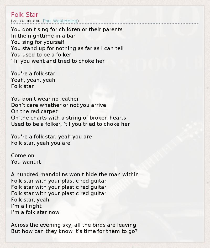 You don't sing for children or their parents In the nighttime in a bar You sing for yourself You stand up for nothing as far as I can tell You used to be a folker 'Til you went and tried to choke her You're a folk star Yeah, yeah, yeah Folk star You don't wear no leather Don't care whether or not you arrive On the red carpet On the charts with a string of broken hearts Used to be a folker, 'til you tried to choke her You're a folk star, yeah you are Folk star, yeah you are Come on You want it A hundred mandolins won't hide the man within Folk star with your plastic red guitar Folk star with your plastic red guitar Folk star with your plastic red guitar Folk star, yeah I'm all right I'm a folk star now Across the evening sky, all the birds are leaving But how can they know it's time for them to go?