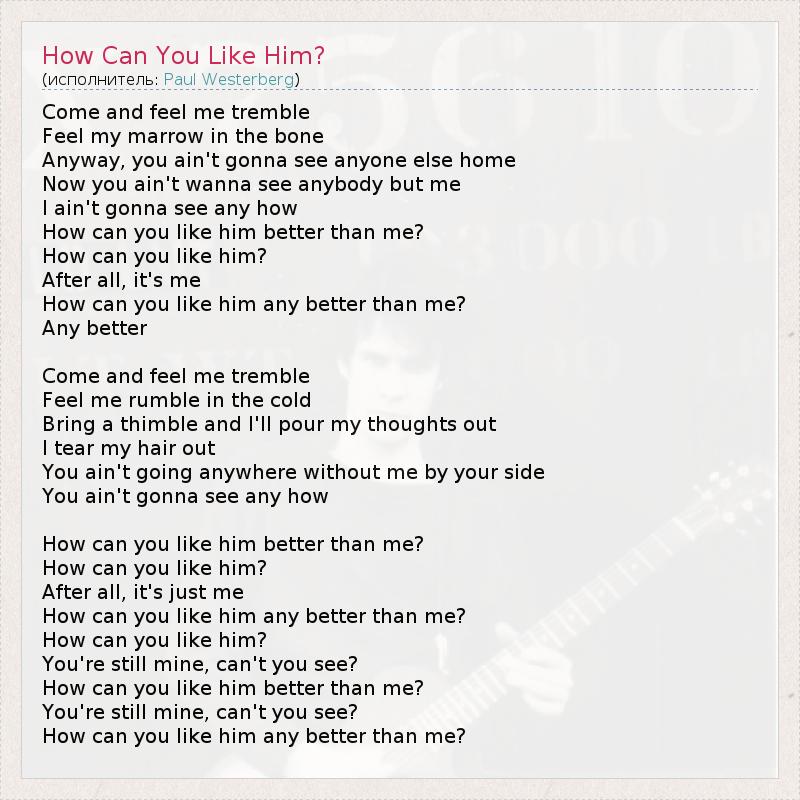 Come and feel me tremble Feel my marrow in the bone Anyway, you ain't gonna see anyone else home Now you ain't wanna see anybody but me I ain't gonna see any how How can you like him better than me? How can you like him? After all, it's me How can you like him any better than me? Any better Come and feel me tremble Feel me rumble in the cold Bring a thimble and I'll pour my thoughts out I tear my hair out You ain't going anywhere without me by your side You ain't gonna see any how How can you like him better than me? How can you like him? After all, it's just me How can you like him any better than me? How can you like him? You're still mine, can't you see? How can you like him better than me? You're still mine, can't you see? How can you like him any better than me?