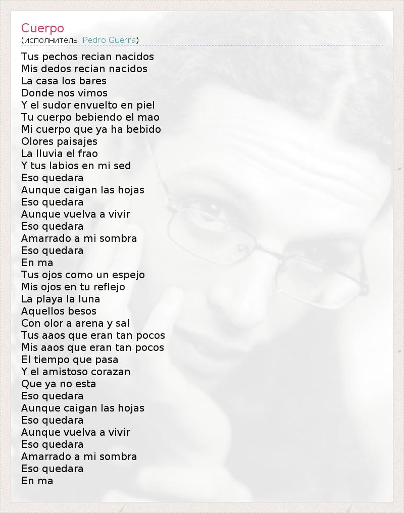 Tus pechos recian nacidos Mis dedos recian nacidos La casa los bares Donde nos vimos Y el sudor envuelto en piel Tu cuerpo bebiendo el mao Mi cuerpo que ya ha bebido Olores paisajes La lluvia el frao Y tus labios en mi sed Eso quedara Aunque caigan las hojas Eso quedara Aunque vuelva a vivir Eso quedara Amarrado a mi sombra Eso quedara En ma Tus ojos como un espejo Mis ojos en tu reflejo La playa la luna Aquellos besos Con olor a arena y sal Tus aaos que eran tan pocos Mis aaos que eran tan pocos El tiempo que pasa Y el amistoso corazan Que ya no esta Eso quedara Aunque caigan las hojas Eso quedara Aunque vuelva a vivir Eso quedara Amarrado a mi sombra Eso quedara En ma