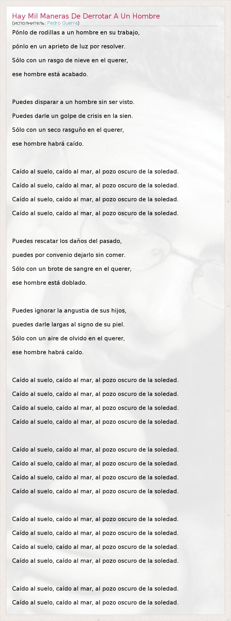 Pónlo de rodillas a un hombre en su trabajo, pónlo en un aprieto de luz por resolver. Sólo con un rasgo de nieve en el querer, ese hombre está acabado. Puedes disparar a un hombre sin ser visto. Puedes darle un golpe de crisis en la sien. Sólo con un seco rasguño en el querer, ese hombre habrá caído. Caído al suelo, caído al mar, al pozo oscuro de la soledad. Caído al suelo, caído al mar, al pozo oscuro de la soledad. Caído al suelo, caído al mar, al pozo oscuro de la soledad. Caído al suelo, caído al mar, al pozo oscuro de la soledad. Puedes rescatar los daños del pasado, puedes por convenio dejarlo sin comer. Sólo con un brote de sangre en el querer, ese hombre está doblado. Puedes ignorar la angustia de sus hijos, puedes darle largas al signo de su piel. Sólo con un aire de olvido en el querer, ese hombre habrá caído. Caído al suelo, caído al mar, al pozo oscuro de la soledad. Caído al suelo, caído al mar, al pozo oscuro de la soledad. Caído al suelo, caído al mar, al pozo oscuro de la soledad. Caído al suelo, caído al mar, al pozo oscuro de la soledad. Caído al suelo, caído al mar, al pozo oscuro de la soledad. Caído al suelo, caído al mar, al pozo oscuro de la soledad. Caído al suelo, caído al mar, al pozo oscuro de la soledad. Caído al suelo, caído al mar, al pozo oscuro de la soledad. Caído al suelo, caído al mar, al pozo oscuro de la soledad. Caído al suelo, caído al mar, al pozo oscuro de la soledad. Caído al suelo, caído al mar, al pozo oscuro de la soledad. Caído al suelo, caído al mar, al pozo oscuro de la soledad. Caído al suelo, caído al mar, al pozo oscuro de la soledad. Caído al suelo, caído al mar, al pozo oscuro de la soledad.