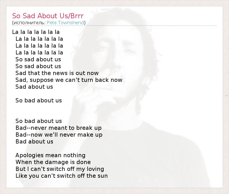 La la la la la la la La la la la la la la La la la la la la la La la la la la la la So sad about us So sad about us Sad that the news is out now Sad, suppose we can't turn back now Sad about us So bad about us So bad about us Bad--never meant to break up Bad--now we'll never make up Bad about us Apologies mean nothing When the damage is done But I can't switch off my loving Like you can't switch off the sun