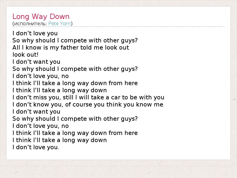I don't love you So why should I compete with other guys? All I know is my father told me look out look out! I don't want you So why should I compete with other guys? I don't love you, no I think I'll take a long way down from here I think I'll take a long way down I don't miss you, still I will take a car to be with you I don't know you, of course you think you know me I don't want you So why should I compete with other guys? I don't love you, no I think I'll take a long way down from here I think I'll take a long way down I don't love you.