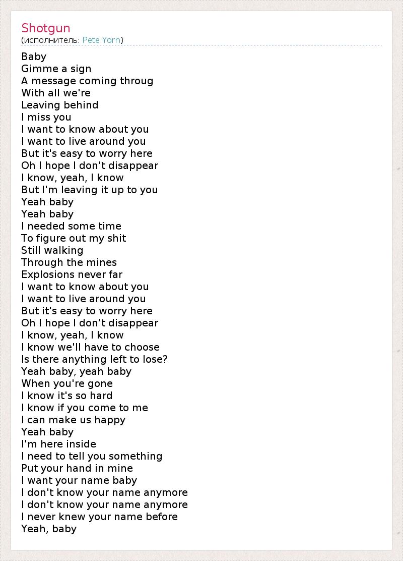 Baby Gimme a sign A message coming throug With all we're Leaving behind I miss you I want to know about you I want to live around you But it's easy to worry here Oh I hope I don't disappear I know, yeah, I know But I'm leaving it up to you Yeah baby Yeah baby I needed some time To figure out my shit Still walking Through the mines Explosions never far I want to know about you I want to live around you But it's easy to worry here Oh I hope I don't disappear I know, yeah, I know I know we'll have to choose Is there anything left to lose? Yeah baby, yeah baby When you're gone I know it's so hard I know if you come to me I can make us happy Yeah baby I'm here inside I need to tell you something Put your hand in mine I want your name baby I don't know your name anymore I don't know your name anymore I never knew your name before Yeah, baby