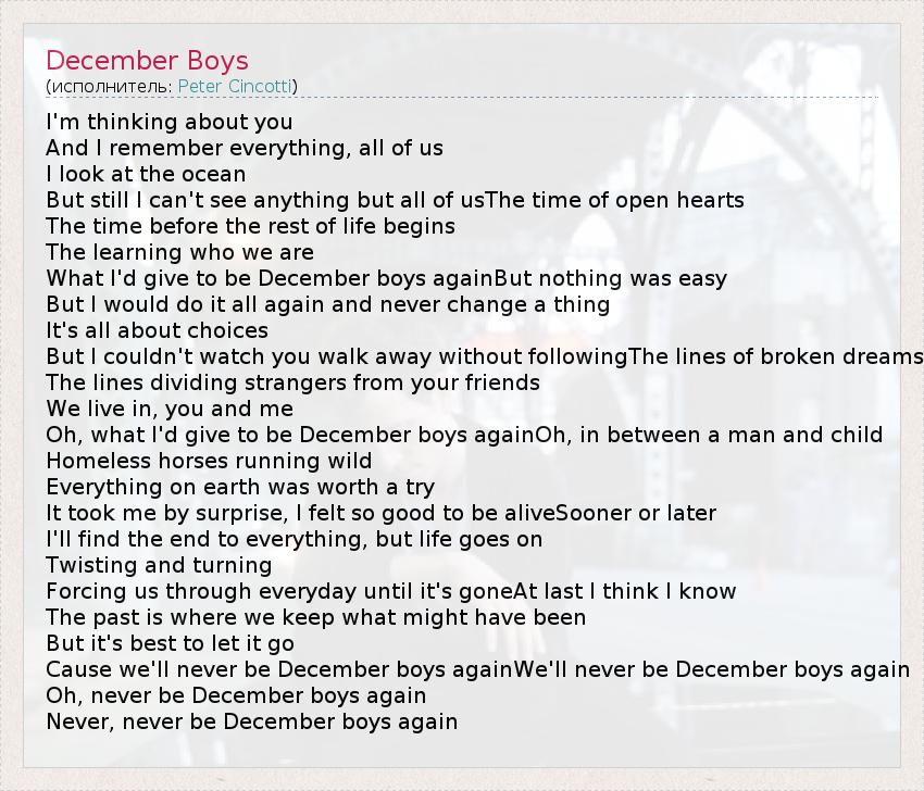 I'm thinking about you And I remember everything, all of us I look at the ocean But still I can't see anything but all of usThe time of open hearts The time before the rest of life begins The learning who we are What I'd give to be December boys againBut nothing was easy But I would do it all again and never change a thing It's all about choices But I couldn't watch you walk away without followingThe lines of broken dreams The lines dividing strangers from your friends We live in, you and me Oh, what I'd give to be December boys againOh, in between a man and child Homeless horses running wild Everything on earth was worth a try It took me by surprise, I felt so good to be aliveSooner or later I'll find the end to everything, but life goes on Twisting and turning Forcing us through everyday until it's goneAt last I think I know The past is where we keep what might have been But it's best to let it go Cause we'll never be December boys againWe'll never be December boys again Oh, never be December boys again Never, never be December boys again