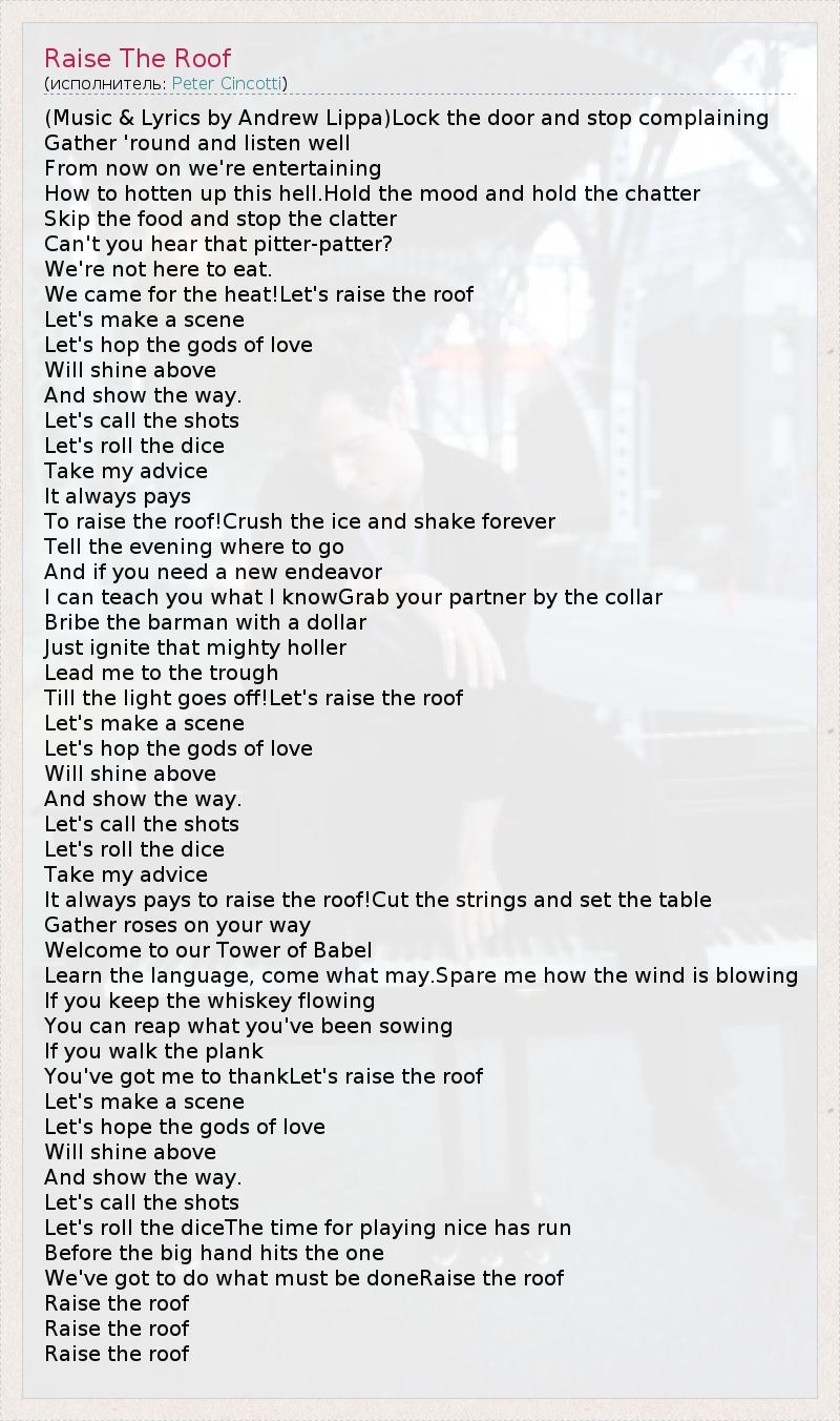 (Music & Lyrics by Andrew Lippa)Lock the door and stop complaining Gather 'round and listen well From now on we're entertaining How to hotten up this hell.Hold the mood and hold the chatter Skip the food and stop the clatter Can't you hear that pitter-patter? We're not here to eat. We came for the heat!Let's raise the roof Let's make a scene Let's hop the gods of love Will shine above And show the way. Let's call the shots Let's roll the dice Take my advice It always pays To raise the roof!Crush the ice and shake forever Tell the evening where to go And if you need a new endeavor I can teach you what I knowGrab your partner by the collar Bribe the barman with a dollar Just ignite that mighty holler Lead me to the trough Till the light goes off!Let's raise the roof Let's make a scene Let's hop the gods of love Will shine above And show the way. Let's call the shots Let's roll the dice Take my advice It always pays to raise the roof!Cut the strings and set the table Gather roses on your way Welcome to our Tower of Babel Learn the language, come what may.Spare me how the wind is blowing If you keep the whiskey flowing You can reap what you've been sowing If you walk the plank You've got me to thankLet's raise the roof Let's make a scene Let's hope the gods of love Will shine above And show the way. Let's call the shots Let's roll the diceThe time for playing nice has run Before the big hand hits the one We've got to do what must be doneRaise the roof Raise the roof Raise the roof Raise the roof