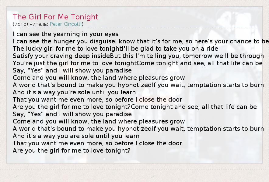 А как ты думаешь, о чем песня "The Girl For Me Tonight" ?
