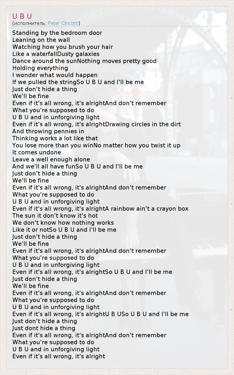 Standing by the bedroom door Leaning on the wall Watching how you brush your hair Like a waterfallDusty galaxies Dance around the sunNothing moves pretty good Holding everything I wonder what would happen If we pulled the stringSo U B U and I'll be me Just don't hide a thing We'll be fine Even if it's all wrong, it's alrightAnd don't remember What you're supposed to do U B U and in unforgiving light Even if it's all wrong, it's alrightDrawing circles in the dirt And throwing pennies in Thinking works a lot like that You lose more than you winNo matter how you twist it up It comes undone Leave a well enough alone And we'll all have funSo U B U and I'll be me Just don't hide a thing We'll be fine Even if it's all wrong, it's alrightAnd don't remember What you're supposed to do U B U and in unforgiving light Even if it's all wrong, it's alrightA rainbow ain't a crayon box The sun it don't know it's hot We don't know how nothing works Like it or notSo U B U and I'll be me Just don't hide a thing We'll be fine Even if it's all wrong, it's alrightAnd don't remember What you're supposed to do U B U and in unforgiving light Even if it's all wrong, it's alrightSo U B U and I'll be me Just don't hide a thing We'll be fine Even if it's all wrong, it's alrightAnd don't remember What you're supposed to do U B U and in unforgiving light Even if it's all wrong, it's alrightU B USo U B U and I'll be me Just don't hide a thing Just dont hide a thing Even if it's all wrong, it's alrightAnd don't remember What you're supposed to do U B U and in unforgiving light Even if it's all wrong, it's alright